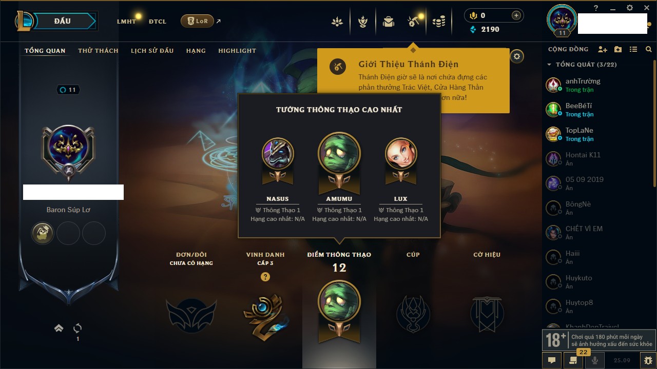 Rank Đơn: Chưa rank mùa nàoKhung: Chưa có khungTướng: 12 - Còn 3853 THXTrang Phục: 2Rank ĐTCL: Chưa RankLinh Thú: 30