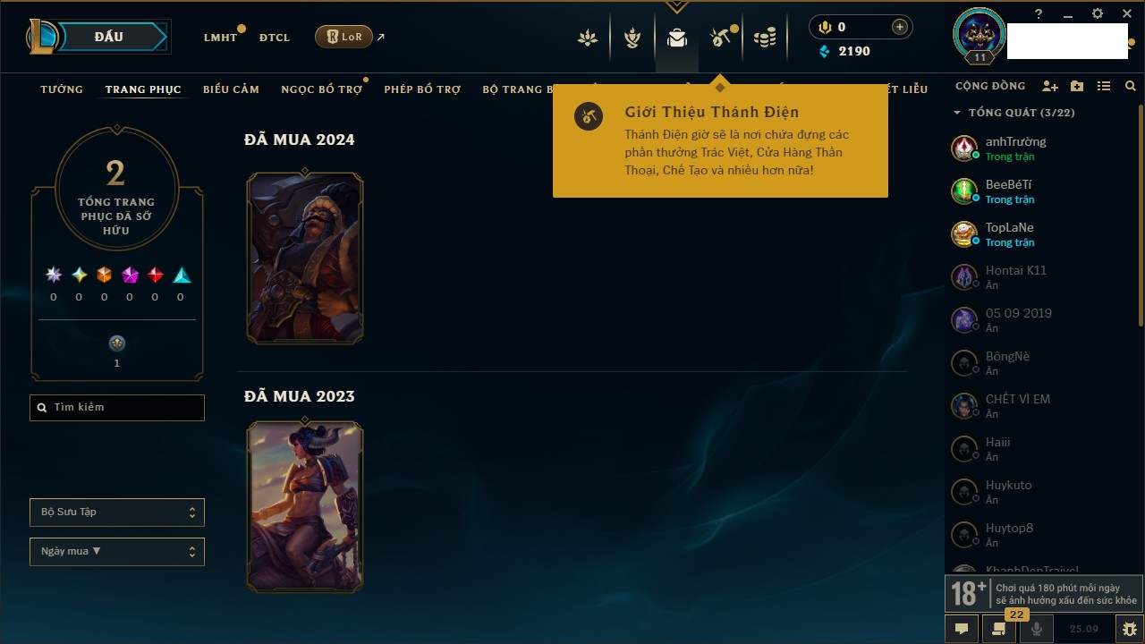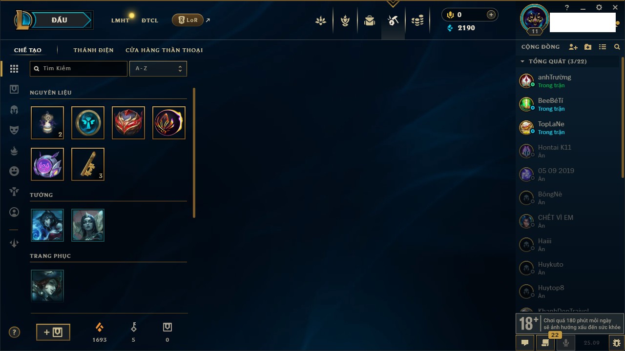 Rank Đơn: Chưa rank mùa nàoKhung: Chưa có khungTướng: 2 - Còn 9000 THXTrang Phục: 0Rank ĐTCL: Bạch Kim IIILinh Thú: 31