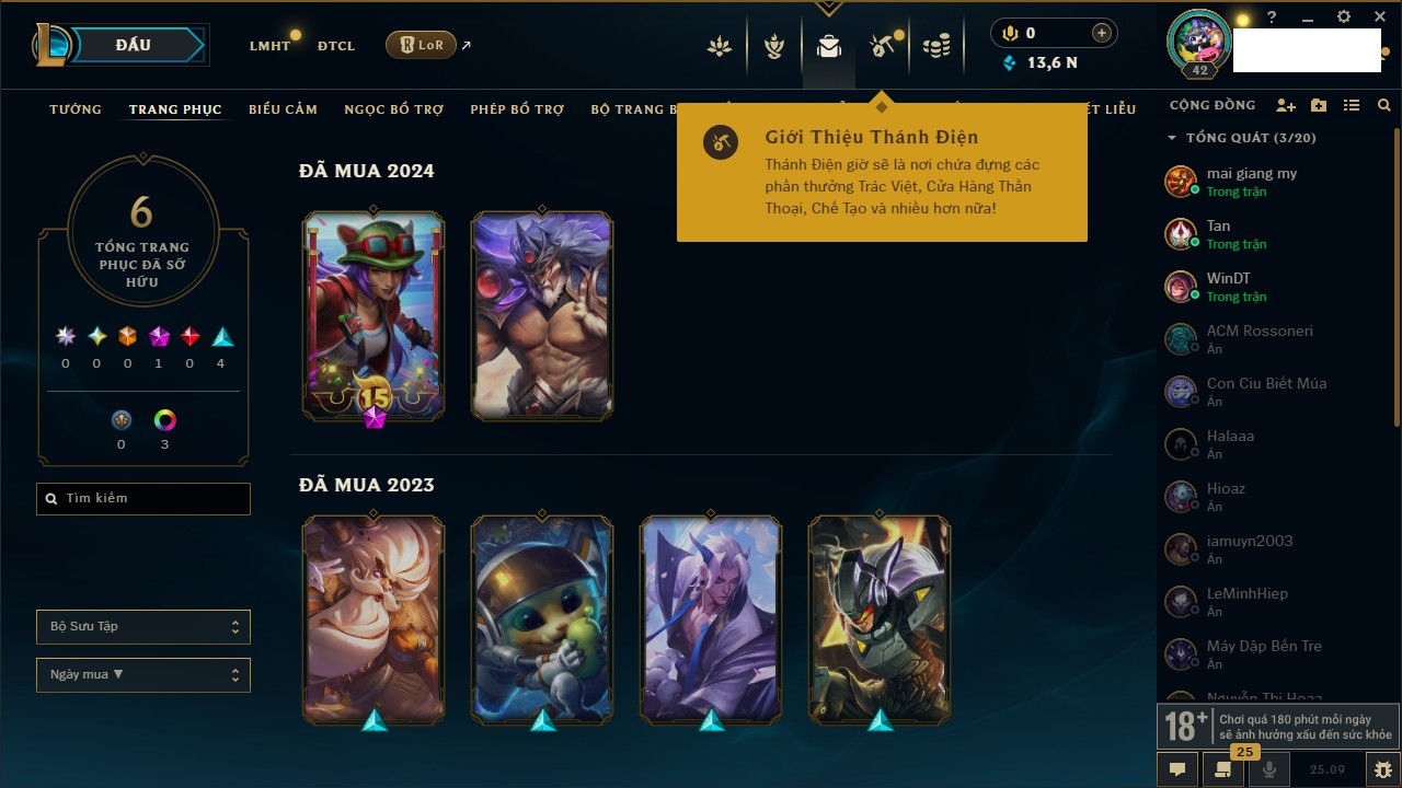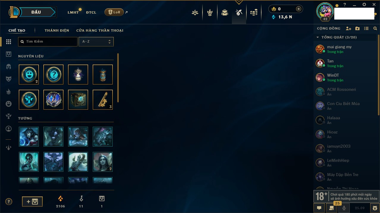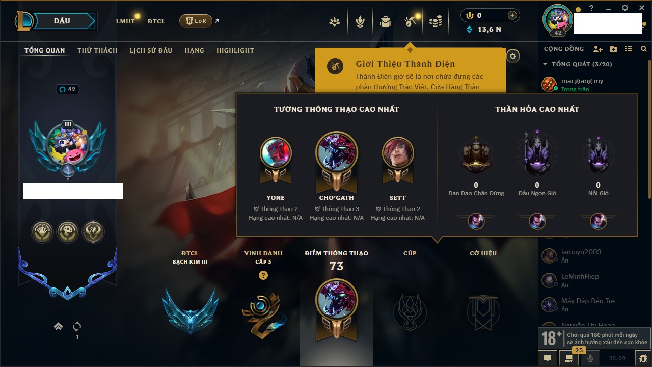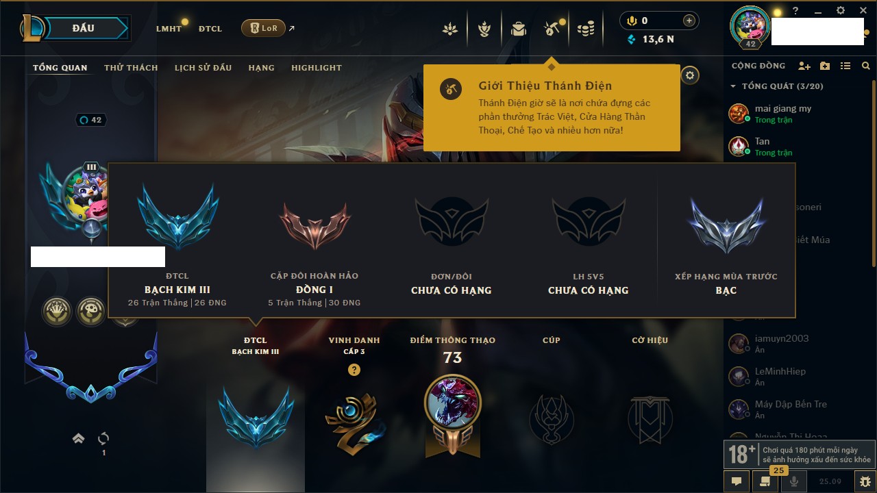 Rank Đơn: Vàng IIIKhung: BạcTướng: 171 - Còn 101359 THXTrang Phục: 88Rank ĐTCL: Kim Cương IVLinh Thú: 200