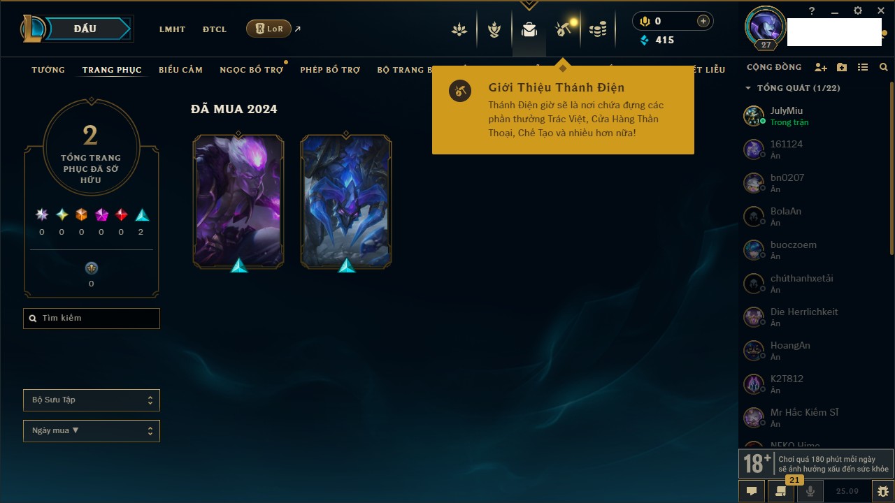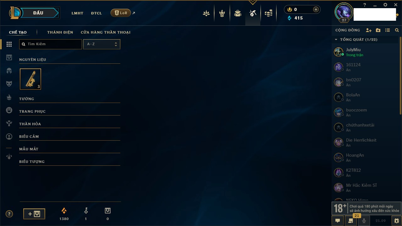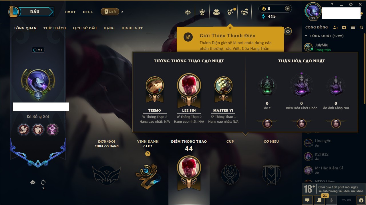 Rank Đơn: Chưa rank mùa nàoKhung: Chưa có khungTướng: 12 - Còn 3853 THXTrang Phục: 2Rank ĐTCL: Chưa RankLinh Thú: 30