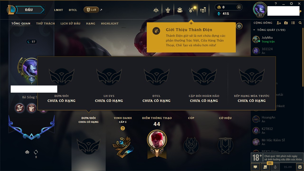 Rank Đơn: Chưa rank mùa nàoKhung: Chưa có khungTướng: 2 - Còn 9000 THXTrang Phục: 0Rank ĐTCL: Bạch Kim IIILinh Thú: 31