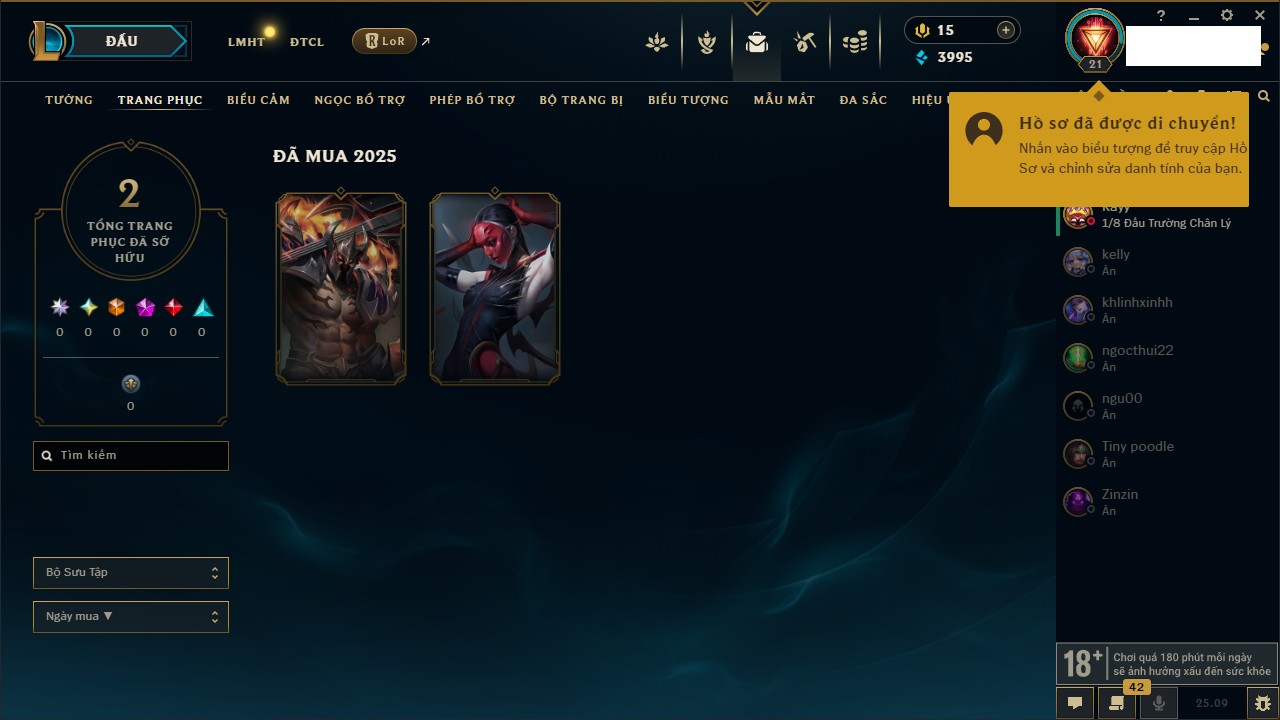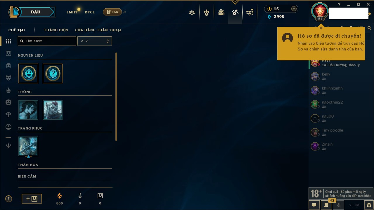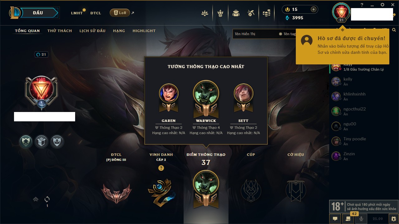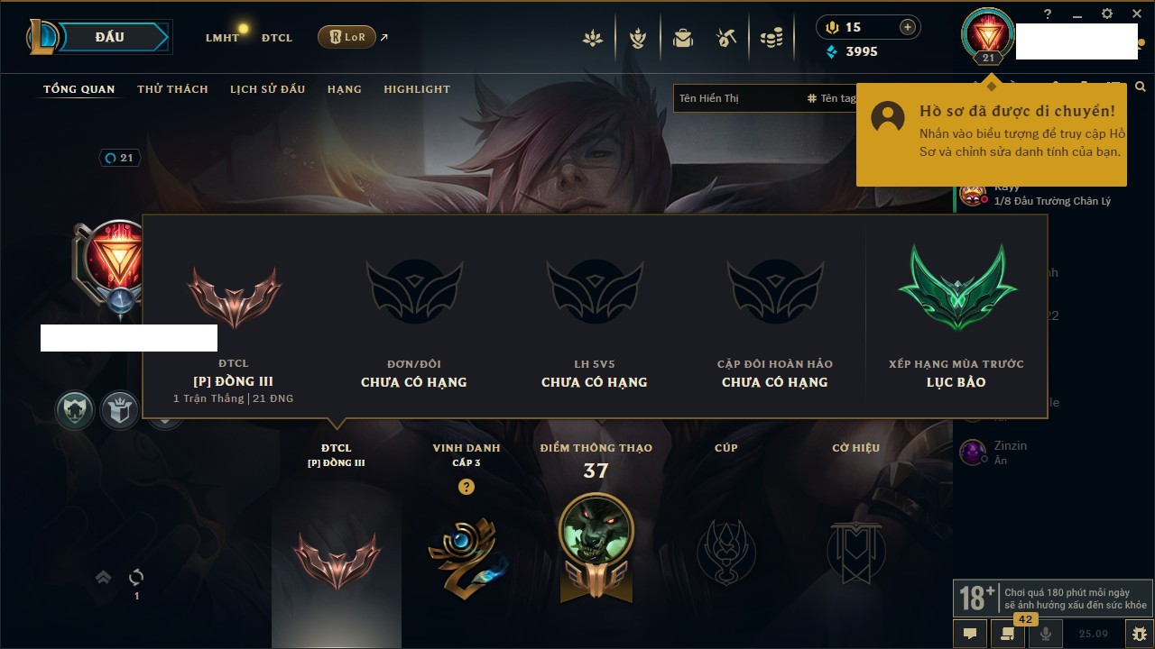 Rank Đơn: Vàng IIIKhung: BạcTướng: 171 - Còn 101359 THXTrang Phục: 88Rank ĐTCL: Kim Cương IVLinh Thú: 200
