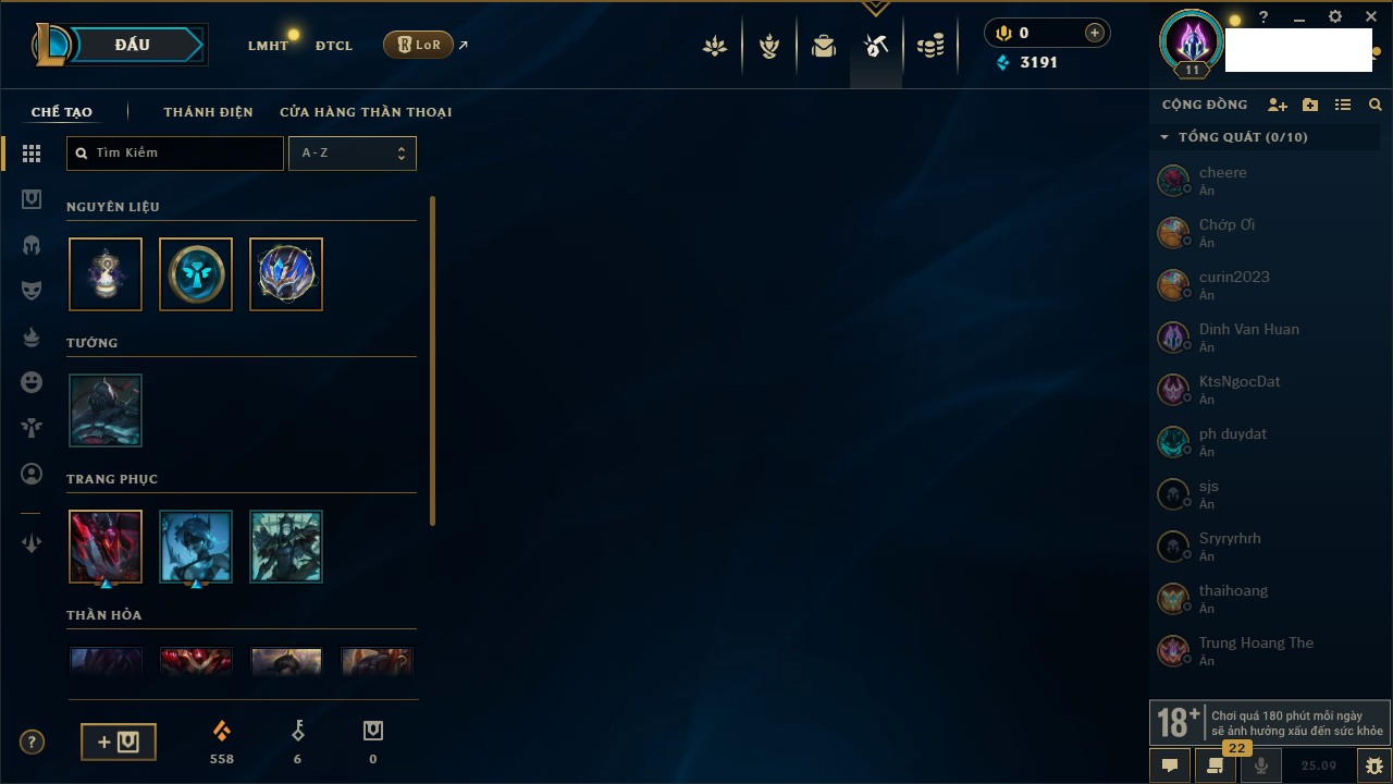 Rank Đơn: Vàng IIIKhung: BạcTướng: 171 - Còn 101359 THXTrang Phục: 88Rank ĐTCL: Kim Cương IVLinh Thú: 200