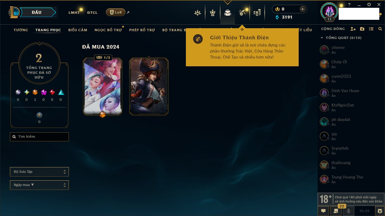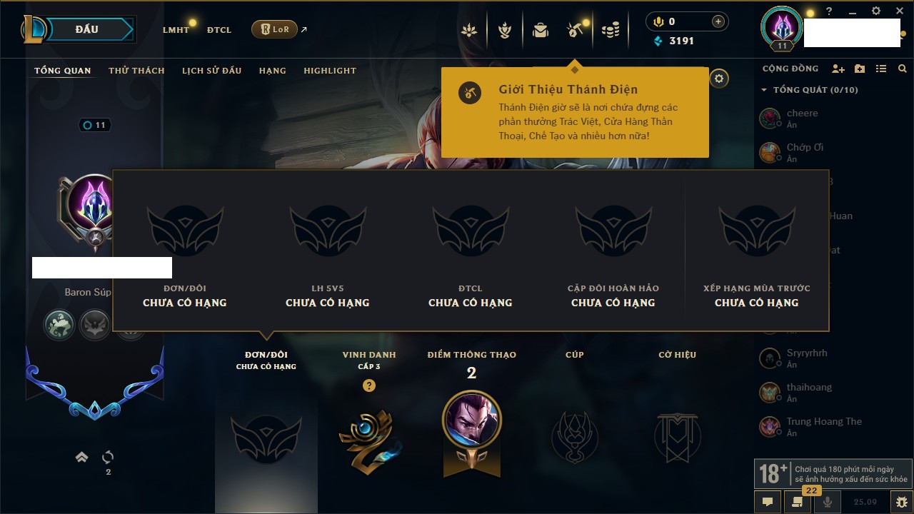 Rank Đơn: Bạc IIIKhung: Chưa có khungTướng: 163 - Còn 66843 THXTrang Phục: 182Rank ĐTCL: Kim Cương IVLinh Thú: 114