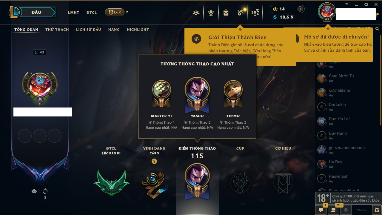Rank Đơn: Bạch Kim IIIKhung: Bạch kimTướng: 59 - Còn 20316 THXTrang Phục: 29Rank ĐTCL: Chưa RankLinh Thú: 3