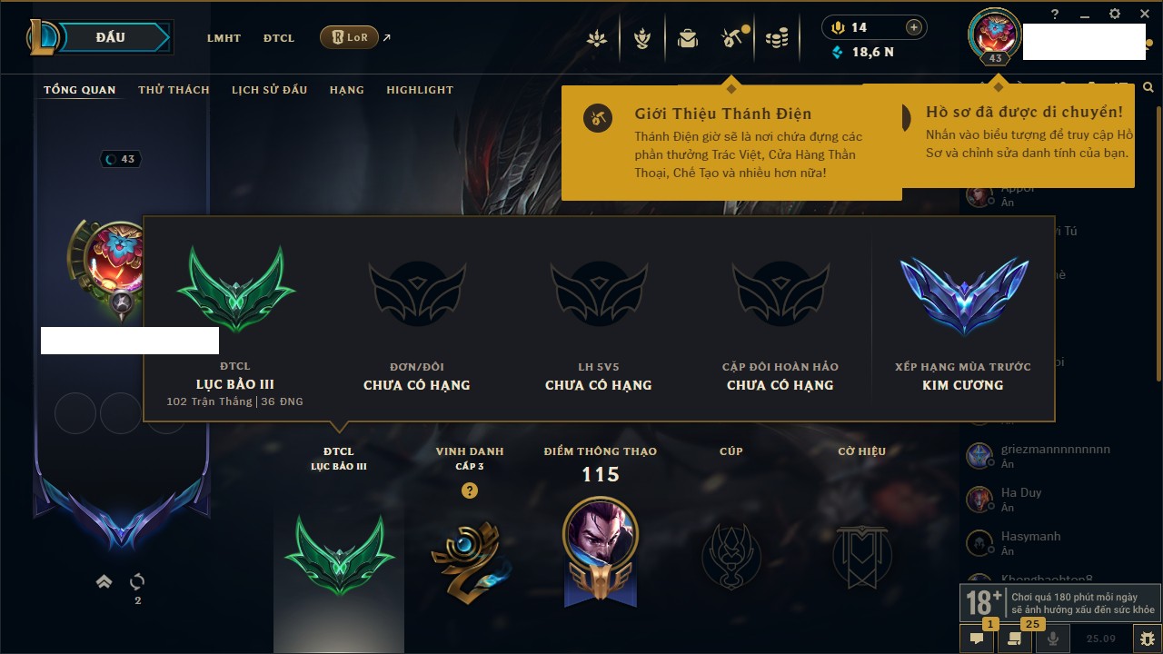 Rank Đơn: Vàng IVKhung: Chưa có khungTướng: 170 - Còn 27840 THXTrang Phục: 77Rank ĐTCL: Chưa RankLinh Thú: 143