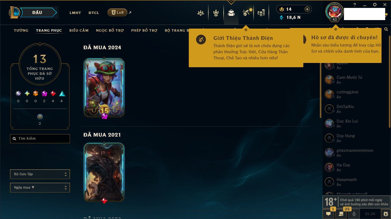 Rank Đơn: Vàng IIIKhung: VàngTướng: 171 - Còn 119894 THXTrang Phục: 108Rank ĐTCL: Lục Bảo IVLinh Thú: 94