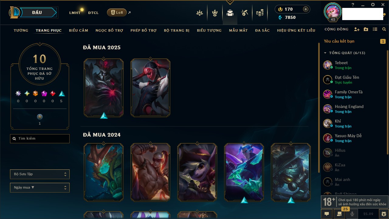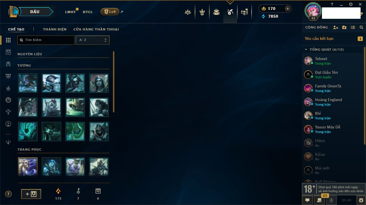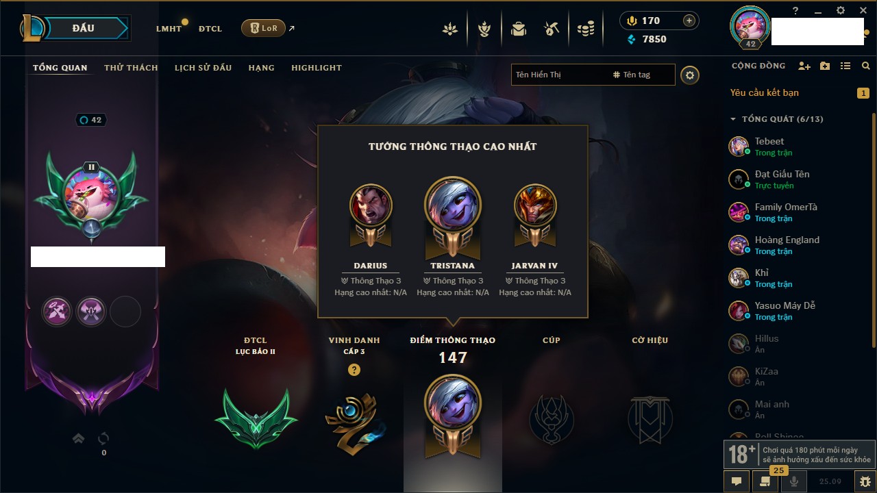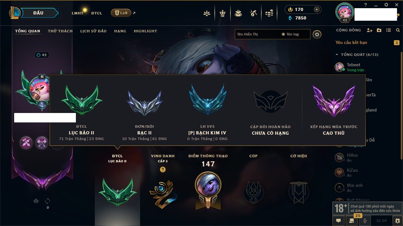 Rank Đơn: Vàng IKhung: Bạch kimTướng: 170 - Còn 212450 THXTrang Phục: 214Rank ĐTCL: Bạch Kim IVLinh Thú: 221
