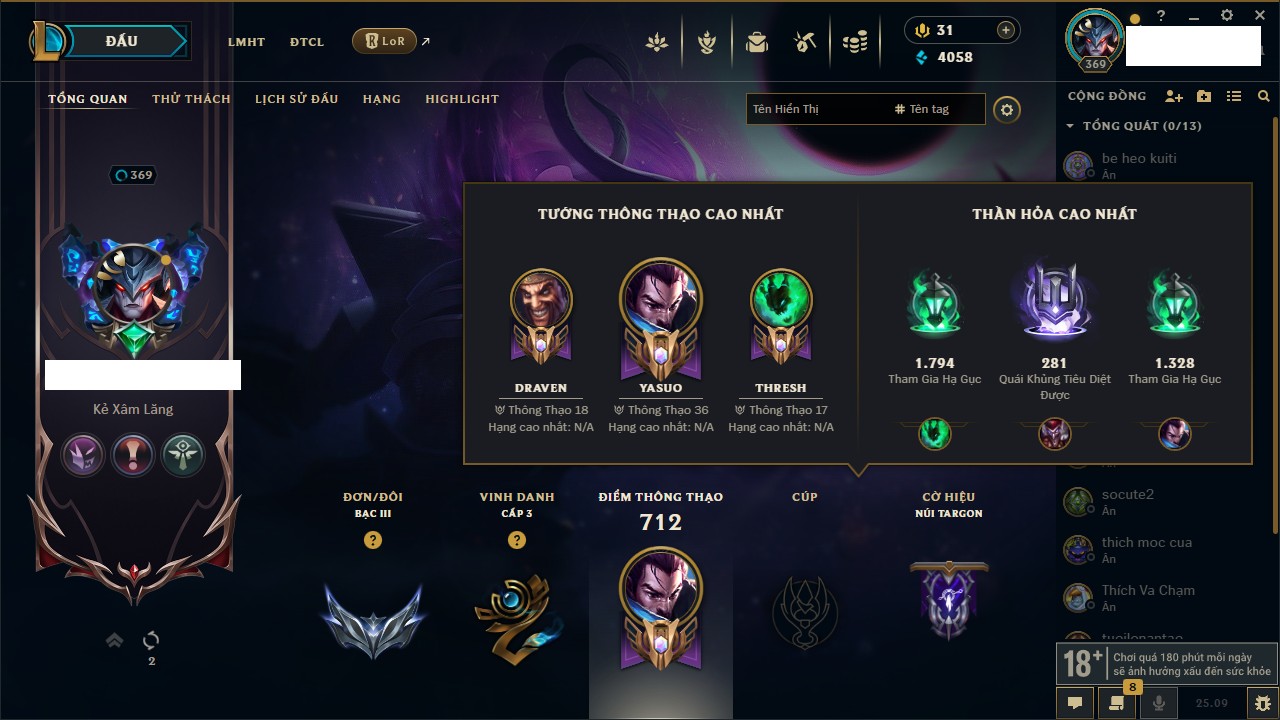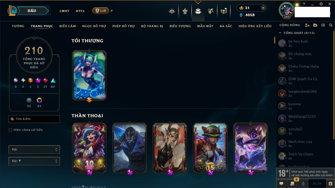 Rank Đơn: Vàng IKhung: BạcTướng: 171 - Còn 60584 THXTrang Phục: 286Rank ĐTCL: Vàng IIILinh Thú: 117
