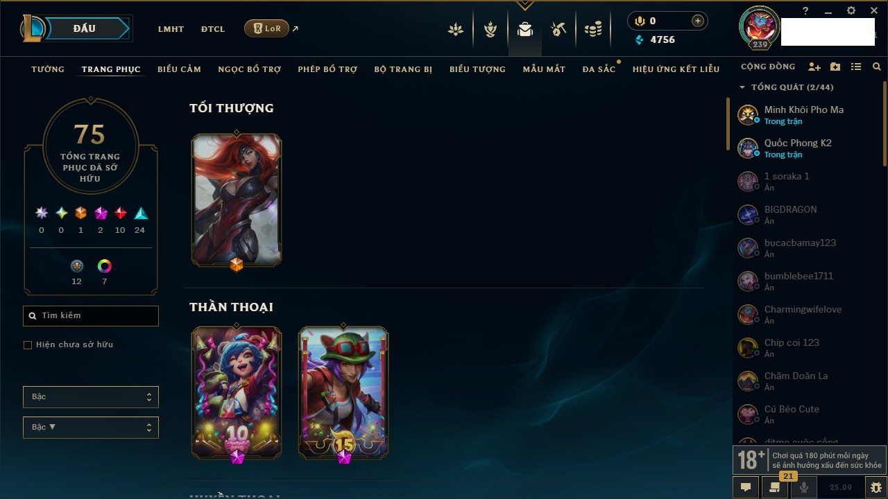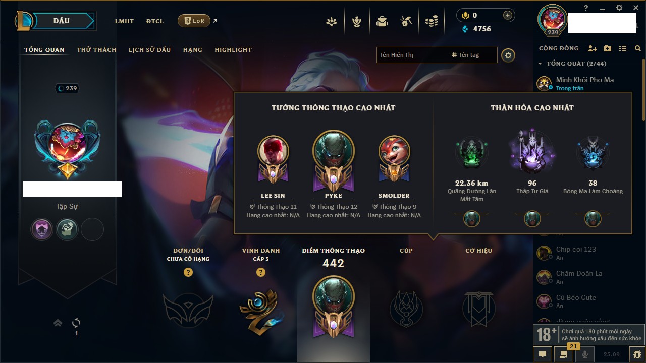 Rank Đơn: Chưa RankKhung: Chưa có khungTướng: 37 - Còn 27387 THXTrang Phục: 10Rank ĐTCL: Chưa RankLinh Thú: 1