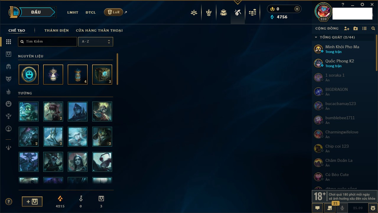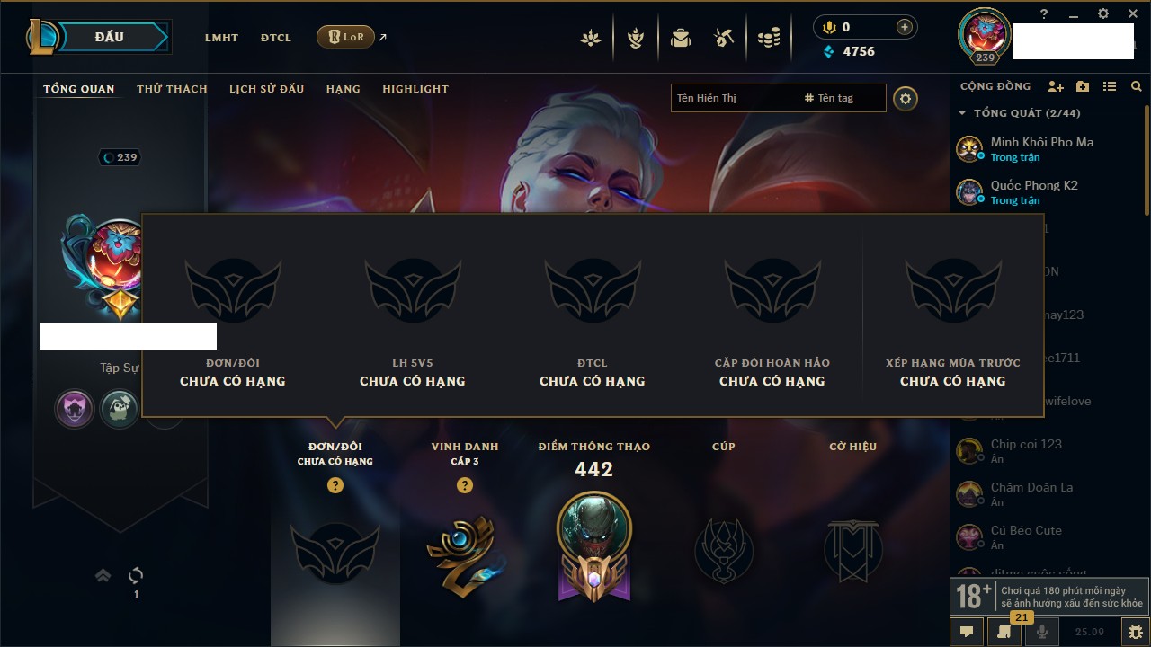 Rank Đơn: Chưa RankKhung: Chưa có khungTướng: 165 - Còn 3214 THXTrang Phục: 160Rank ĐTCL: Chưa RankLinh Thú: 28