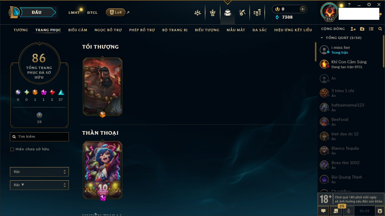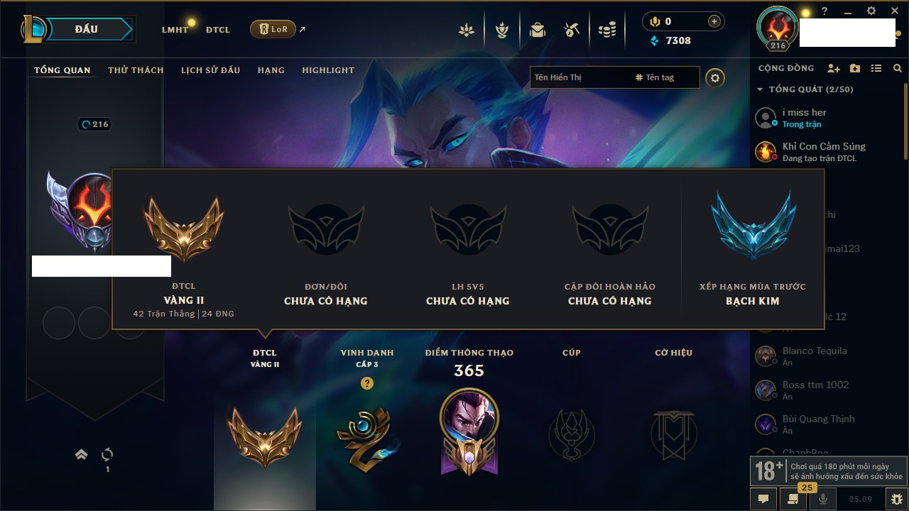Rank Đơn: Vàng IKhung: BạcTướng: 171 - Còn 60584 THXTrang Phục: 286Rank ĐTCL: Vàng IIILinh Thú: 117