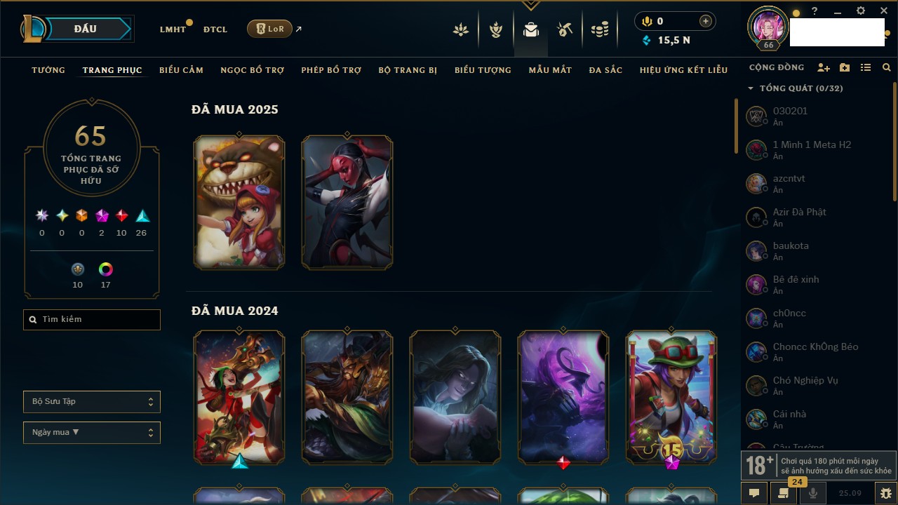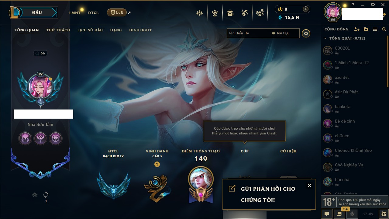 Rank Đơn: Chưa RankKhung: Bạch kimTướng: 172 - Còn 179290 THXTrang Phục: 187Rank ĐTCL: Chưa RankLinh Thú: 49