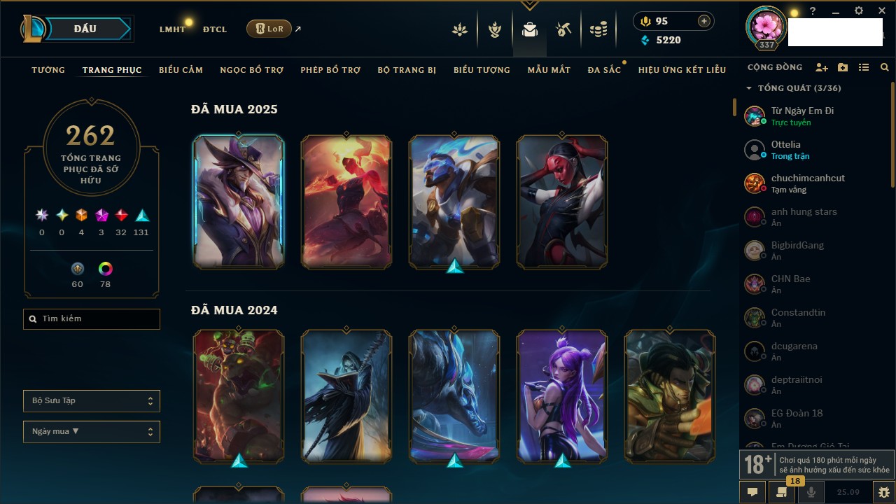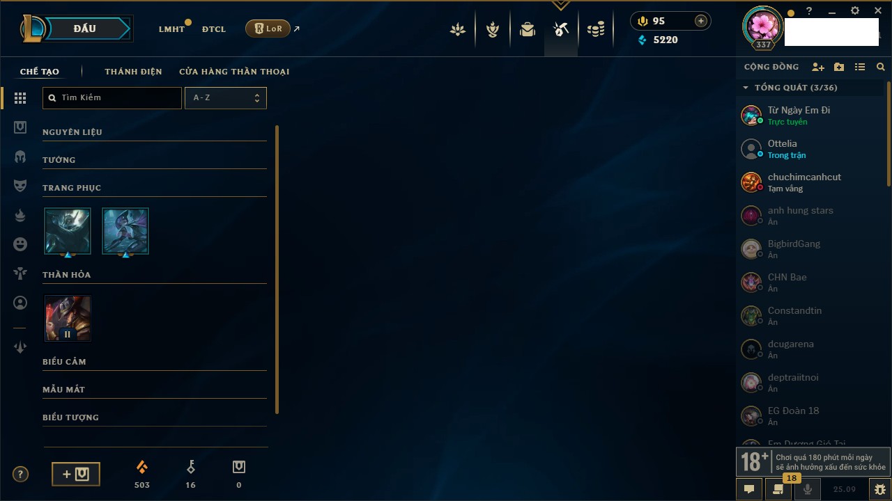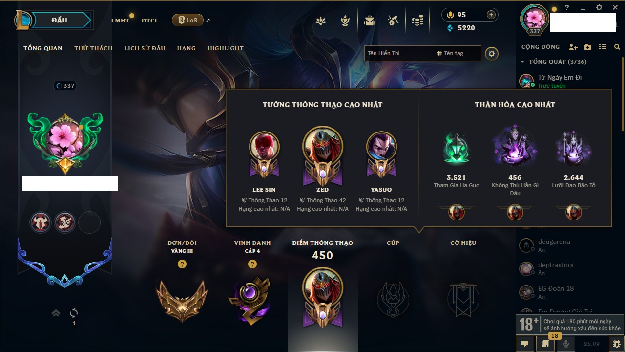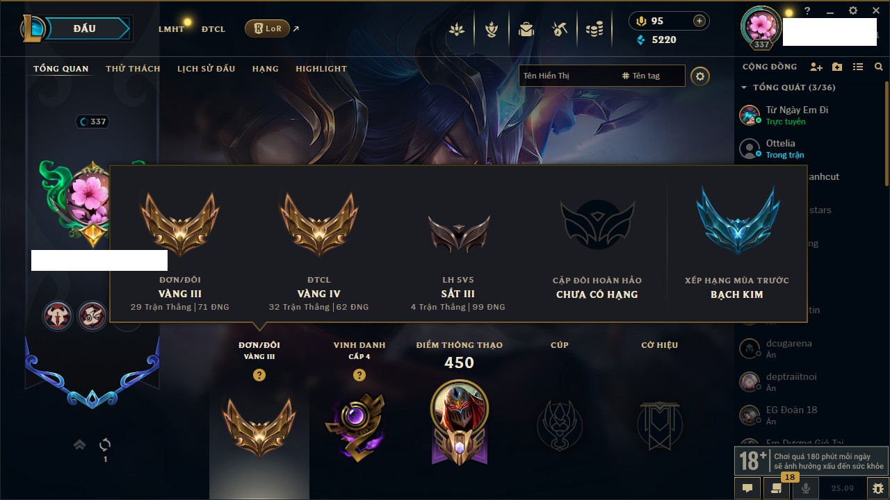 Rank Đơn: Vàng IKhung: Bạch kimTướng: 170 - Còn 212450 THXTrang Phục: 214Rank ĐTCL: Bạch Kim IVLinh Thú: 221
