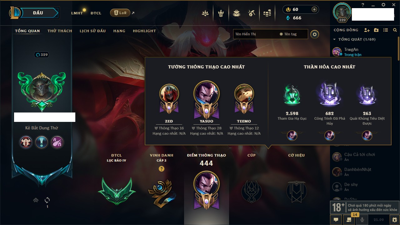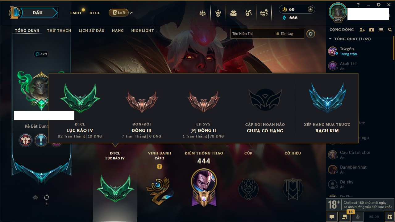 Rank Đơn: Đồng IIKhung: ĐồngTướng: 170 - Còn 66145 THXTrang Phục: 215Rank ĐTCL: Chưa RankLinh Thú: 52