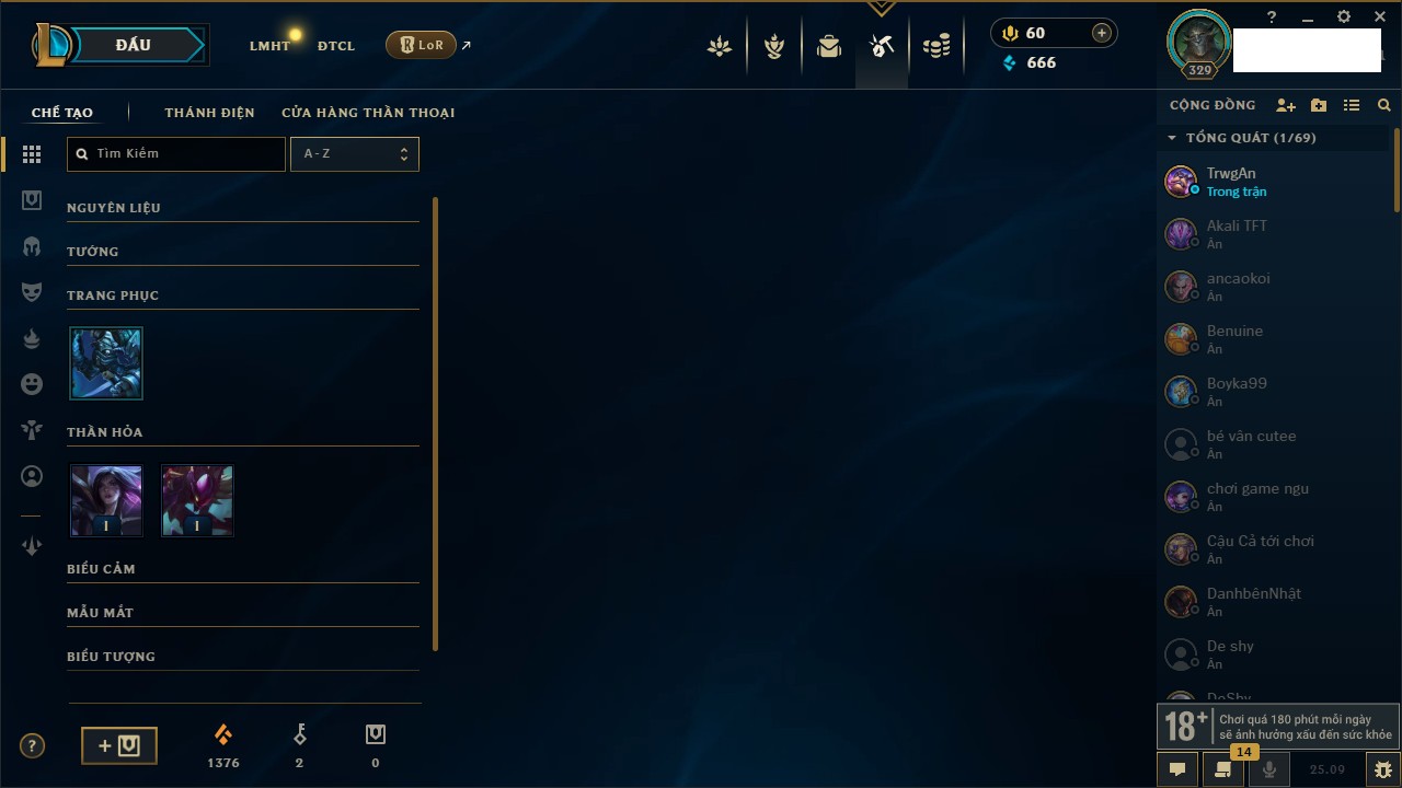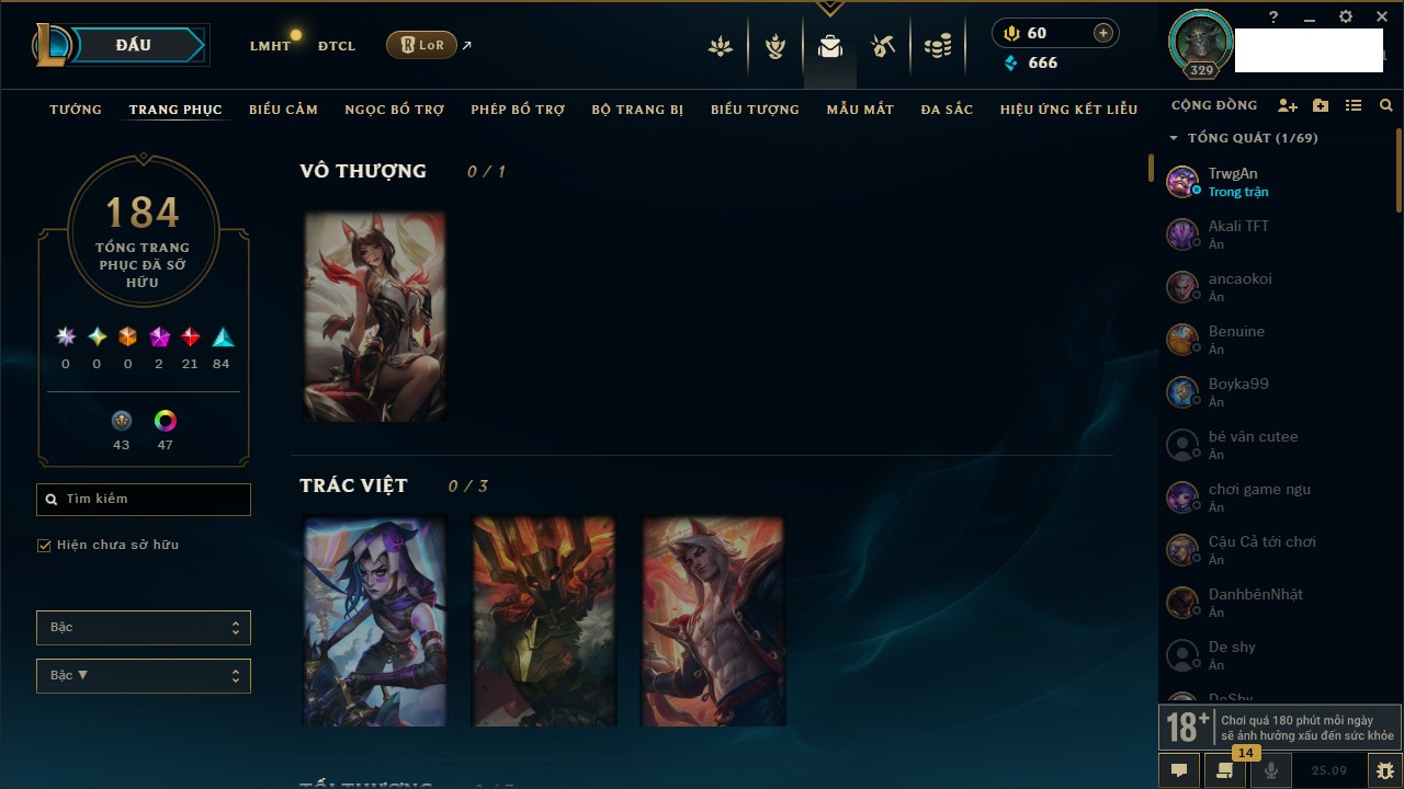 Rank Đơn: Vàng IIIKhung: BạcTướng: 171 - Còn 101359 THXTrang Phục: 88Rank ĐTCL: Kim Cương IVLinh Thú: 200