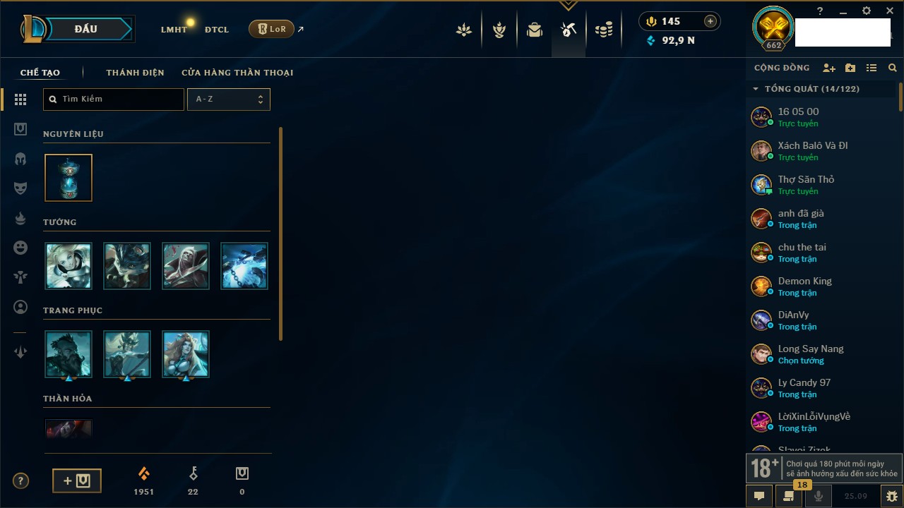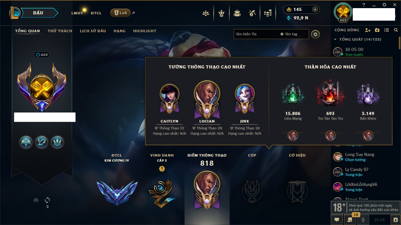 Rank Đơn: Bạch Kim IVKhung: Bạch kimTướng: 171 - Còn 182788 THXTrang Phục: 158Rank ĐTCL: Lục Bảo IVLinh Thú: 56
