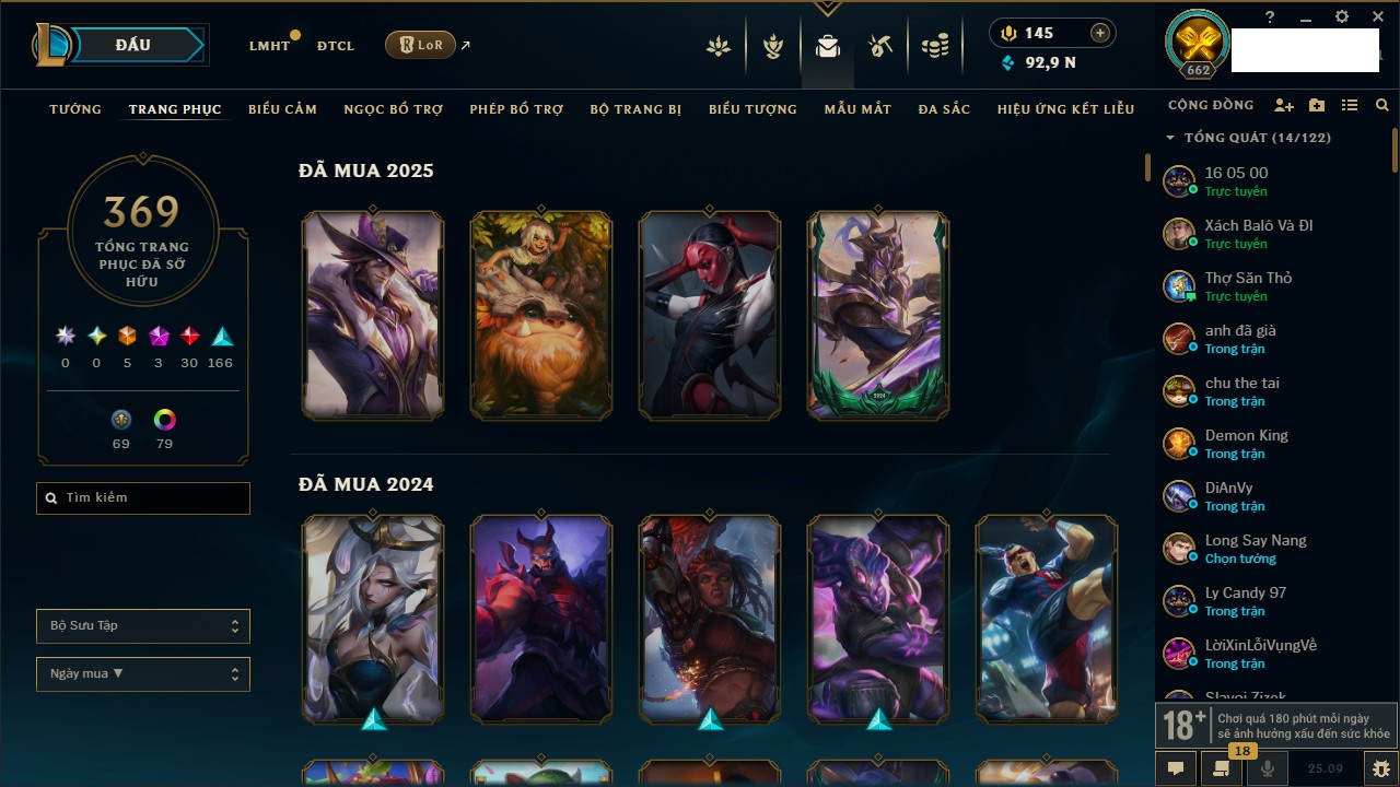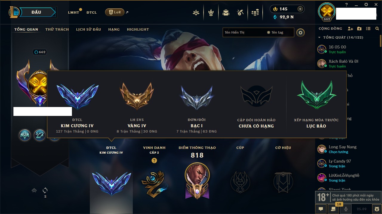 Rank Đơn: Vàng IKhung: Bạch kimTướng: 170 - Còn 212450 THXTrang Phục: 214Rank ĐTCL: Bạch Kim IVLinh Thú: 221