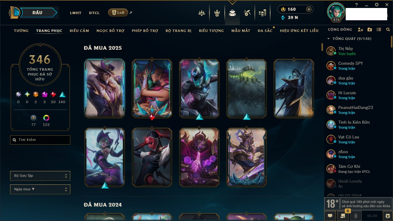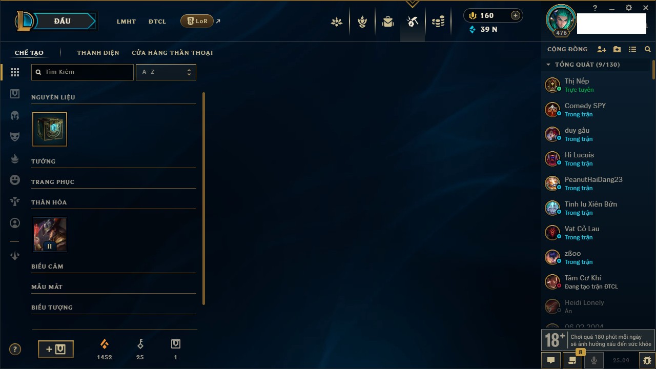 Rank Đơn: Chưa RankKhung: Chưa có khungTướng: 170 - Còn 72514 THXTrang Phục: 202Rank ĐTCL: Chưa RankLinh Thú: 191