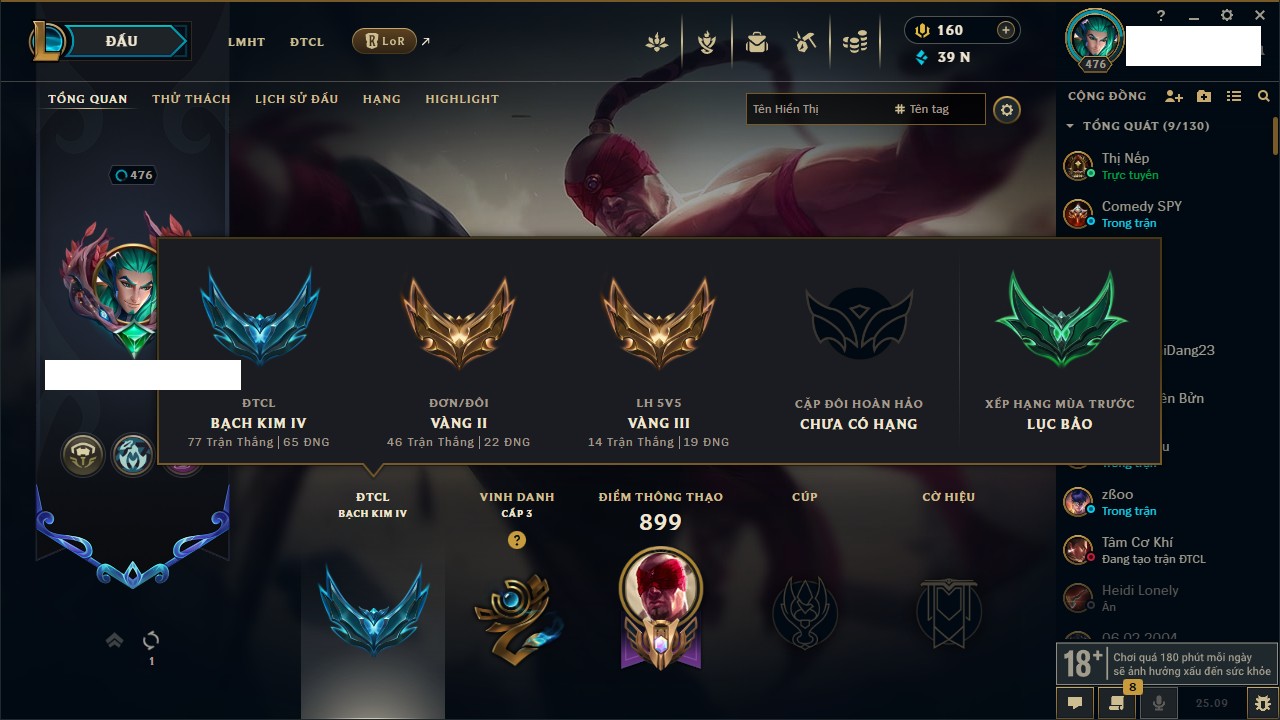 Rank Đơn: Sắt IKhung: Chưa có khungTướng: 171 - Còn 89600 THXTrang Phục: 513Rank ĐTCL: Chưa RankLinh Thú: 57