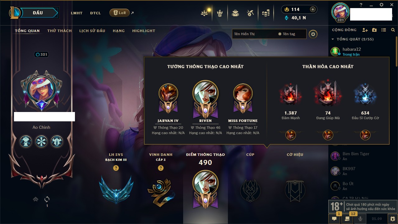 Rank Đơn: Bạch Kim IIKhung: Bạch kimTướng: 171 - Còn 316137 THXTrang Phục: 89Rank ĐTCL: Bạch Kim IIILinh Thú: 94