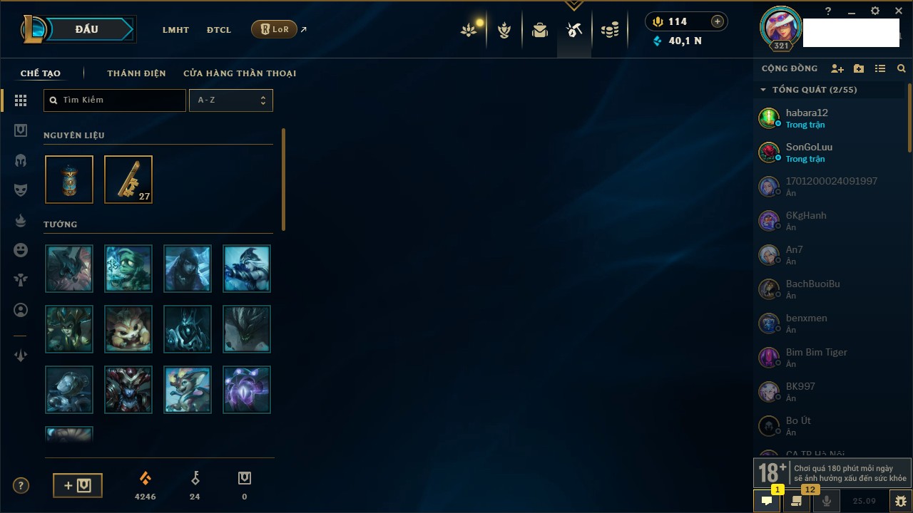 Rank Đơn: Lục Bảo IVKhung: VàngTướng: 171 - Còn 154648 THXTrang Phục: 203Rank ĐTCL: Bạch Kim IVLinh Thú: 69