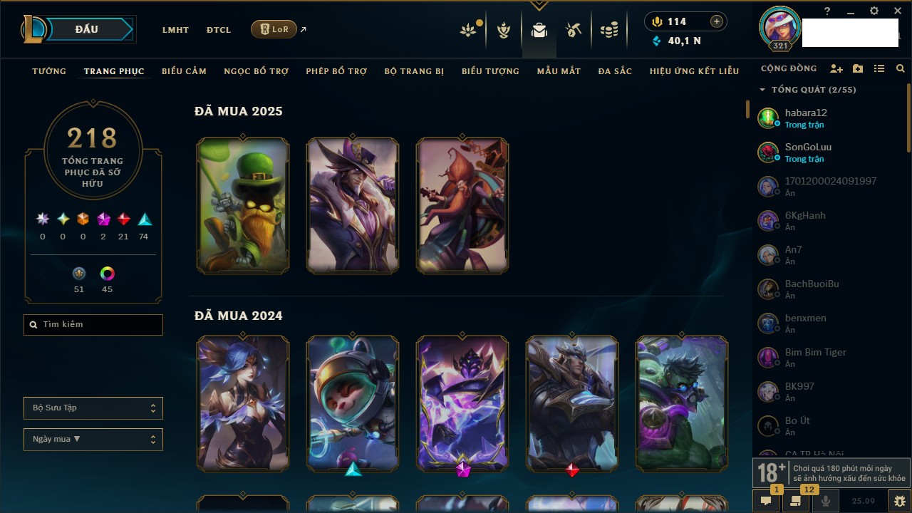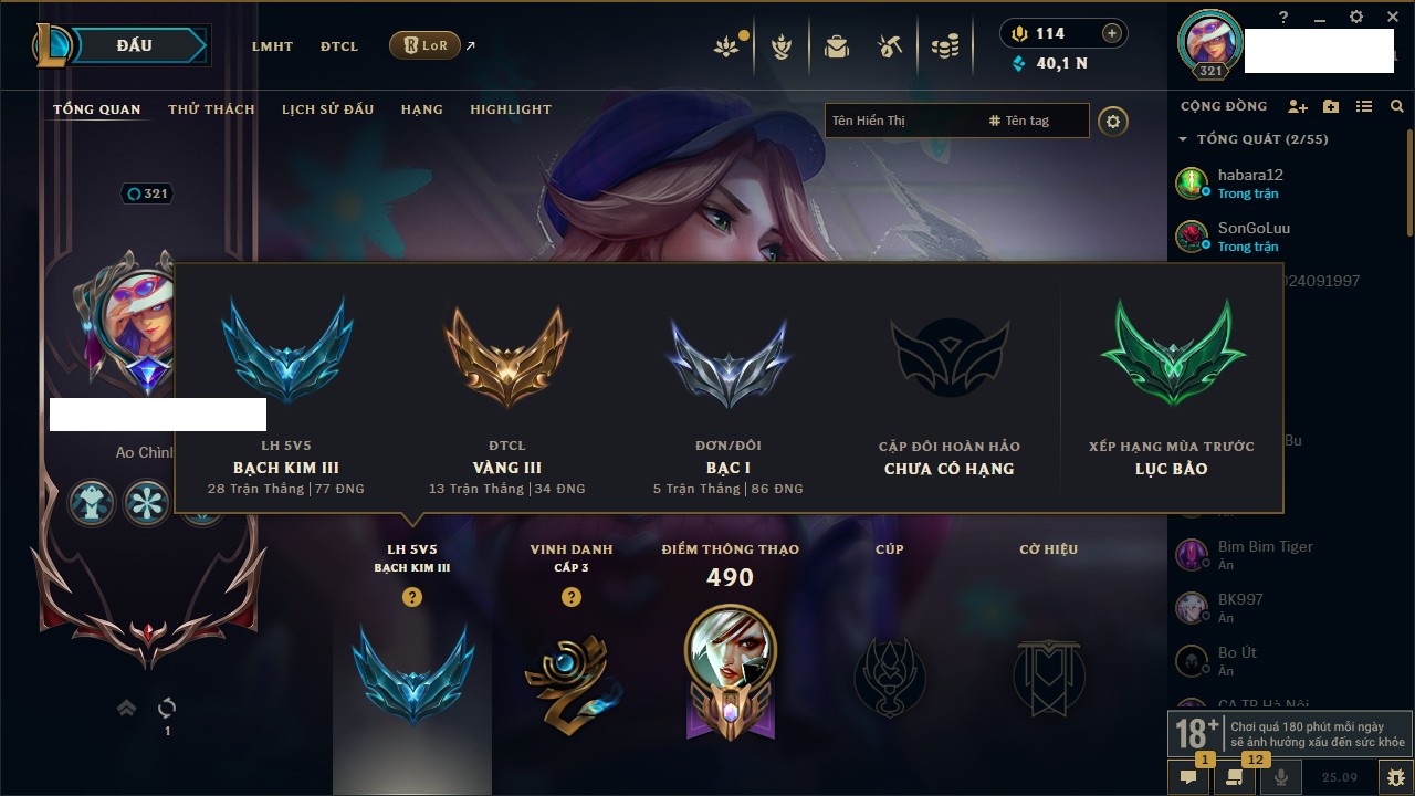 Rank Đơn: Bạch Kim IIIKhung: Bạch kimTướng: 171 - Còn 136108 THXTrang Phục: 261Rank ĐTCL: Bạc IVLinh Thú: 73