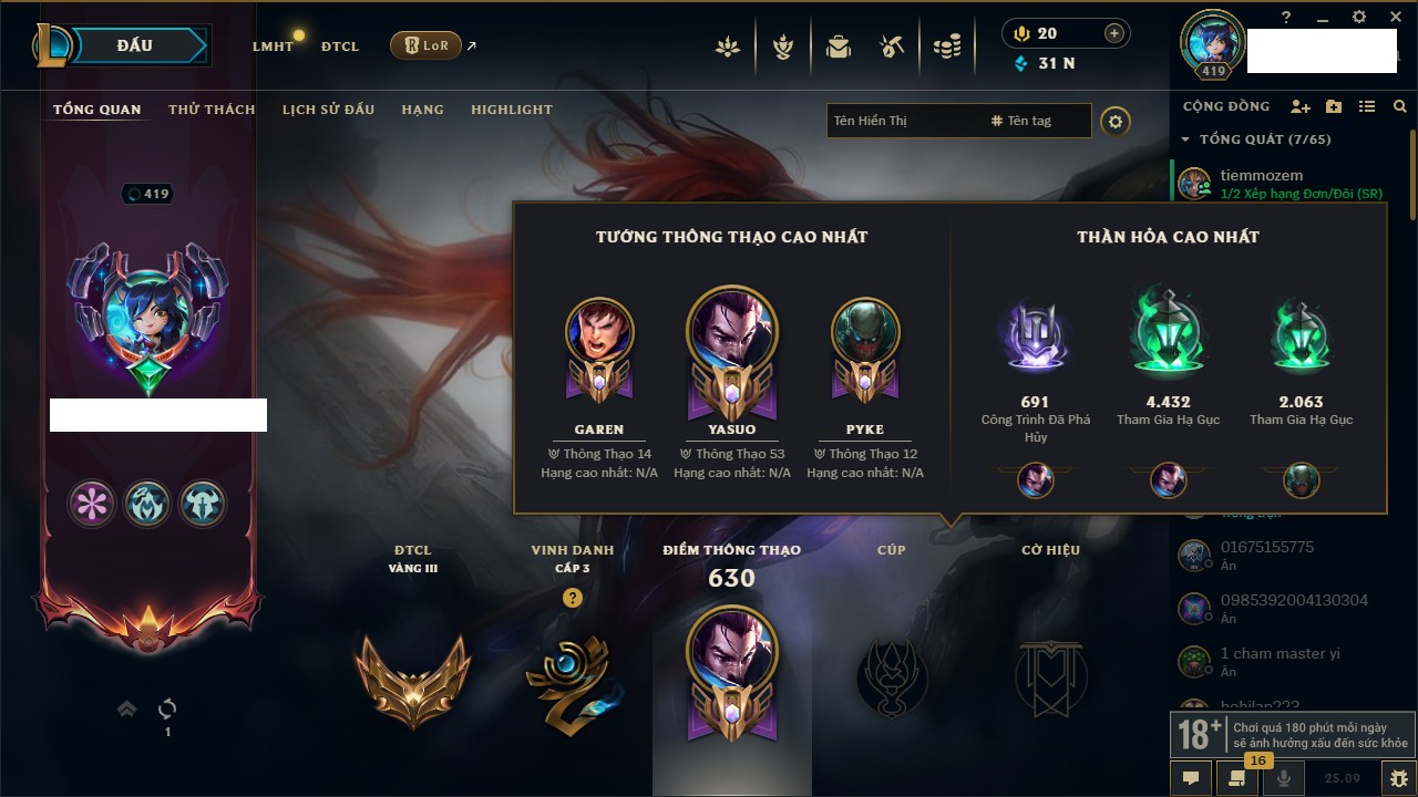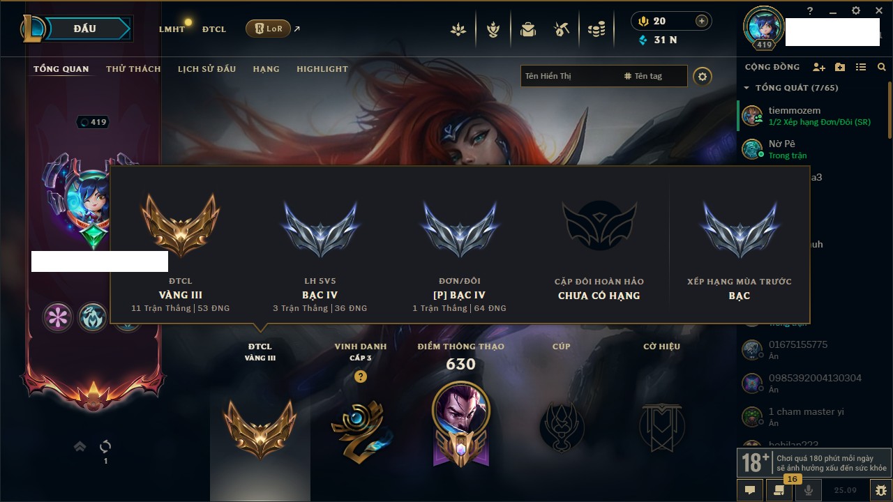 Rank Đơn: Sắt IIIKhung: SắtTướng: 171 - Còn 62070 THXTrang Phục: 198Rank ĐTCL: Bạch Kim IIILinh Thú: 237
