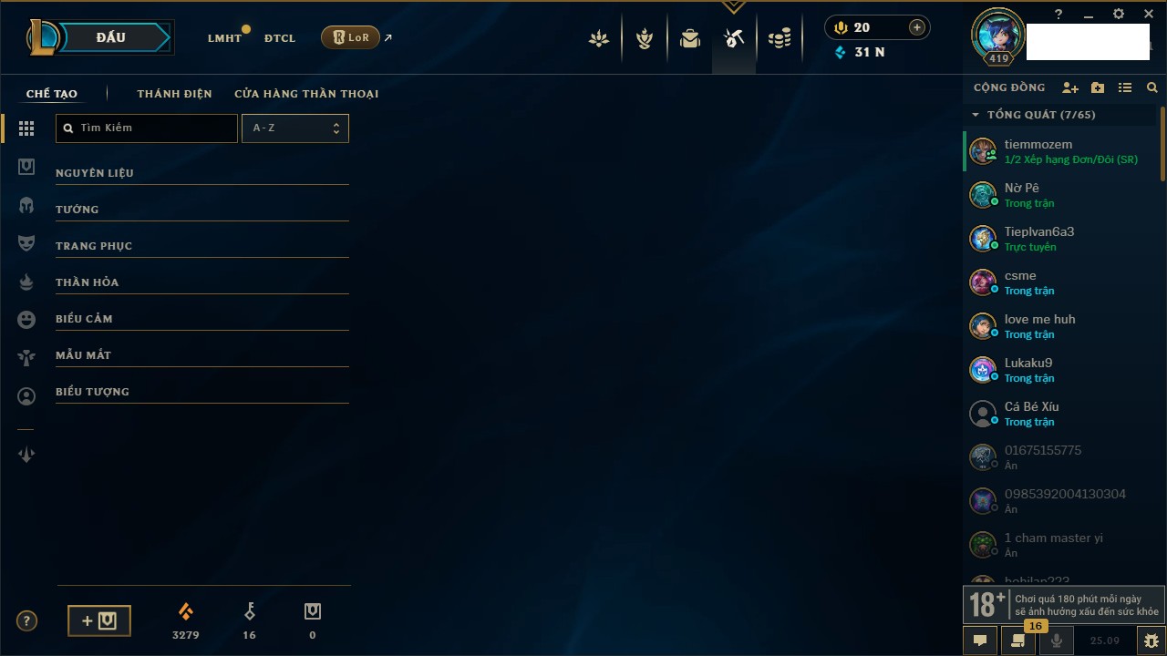 Rank Đơn: Vàng IIIKhung: VàngTướng: 171 - Còn 212486 THXTrang Phục: 201Rank ĐTCL: Bạc ILinh Thú: 79