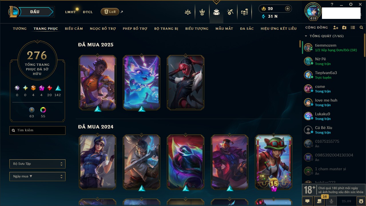 Rank Đơn: Bạch Kim IVKhung: VàngTướng: 171 - Còn 130578 THXTrang Phục: 253Rank ĐTCL: Chưa RankLinh Thú: 20