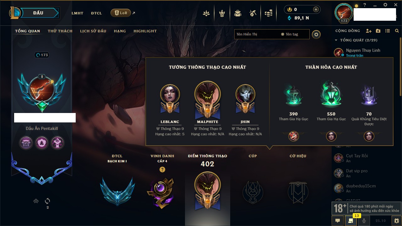 Rank Đơn: Vàng IVKhung: BạcTướng: 166 - Còn 180925 THXTrang Phục: 163Rank ĐTCL: Chưa RankLinh Thú: 67