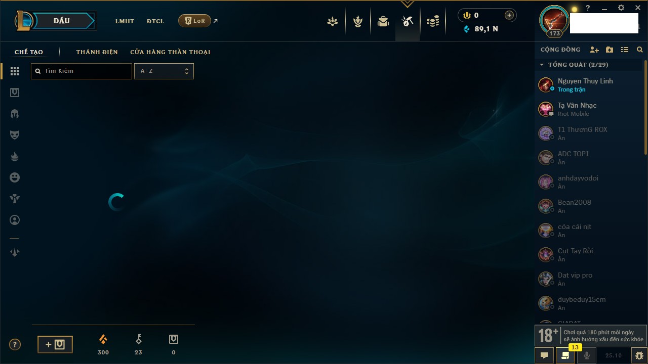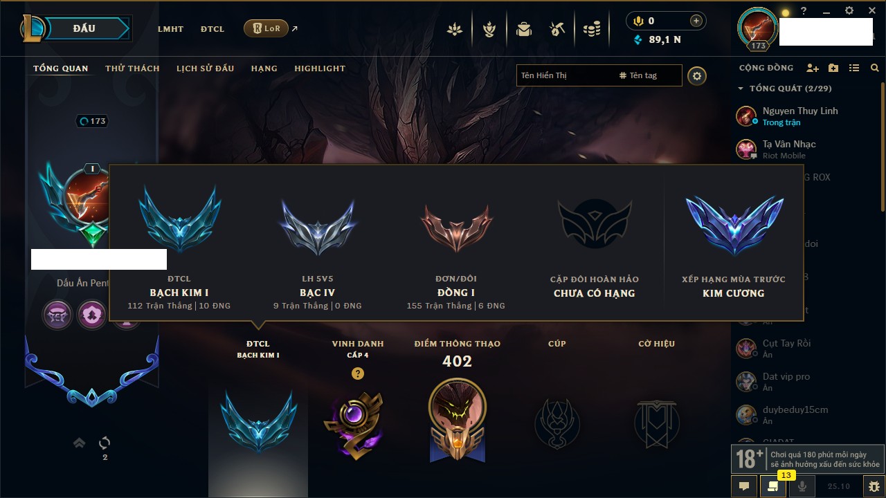Rank Đơn: Bạc IIKhung: VàngTướng: 171 - Còn 332462 THXTrang Phục: 165Rank ĐTCL: Kim Cương IVLinh Thú: 181