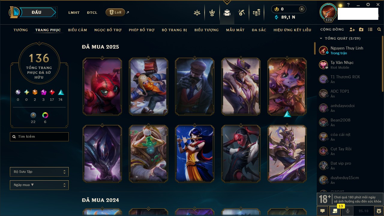 Rank Đơn: Vàng IVKhung: VàngTướng: 171 - Còn 48721 THXTrang Phục: 171Rank ĐTCL: Chưa RankLinh Thú: 27