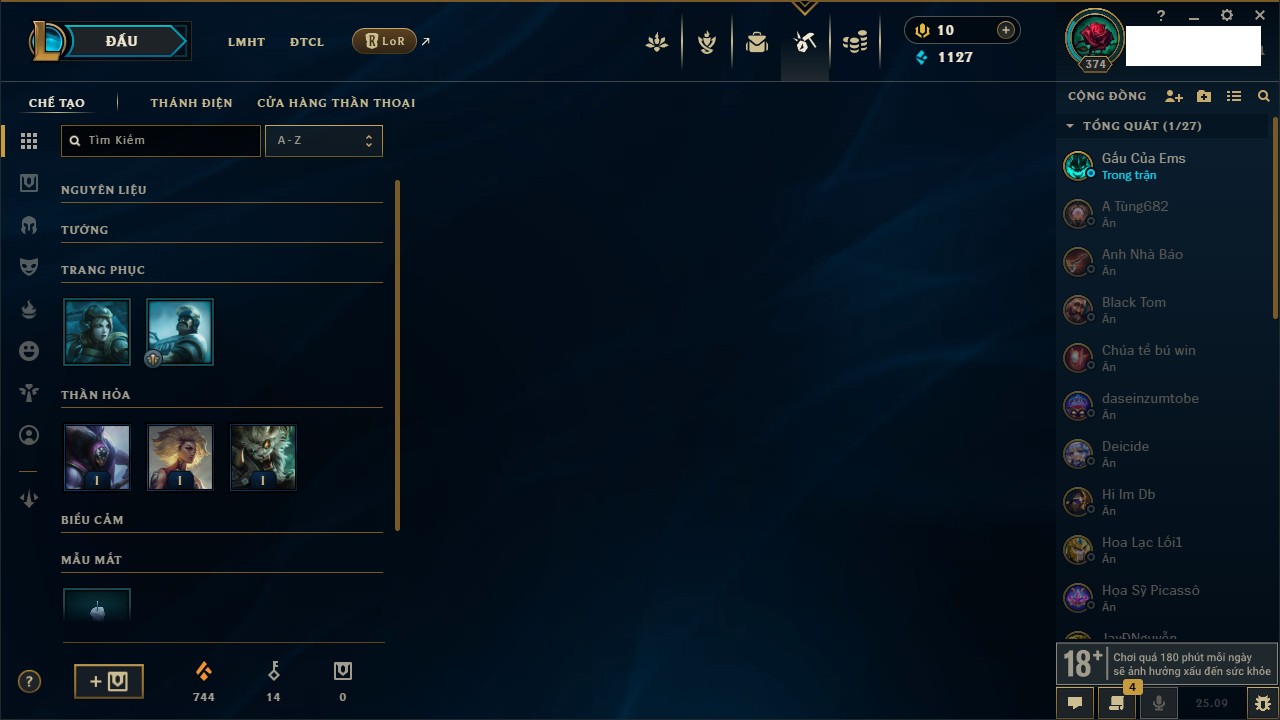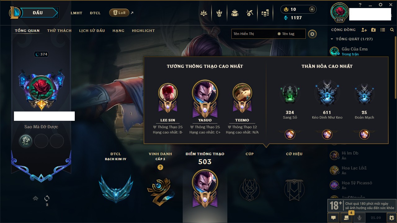 Rank Đơn: Bạc IVKhung: VàngTướng: 172 - Còn 358384 THXTrang Phục: 177Rank ĐTCL: Lục Bảo IILinh Thú: 211