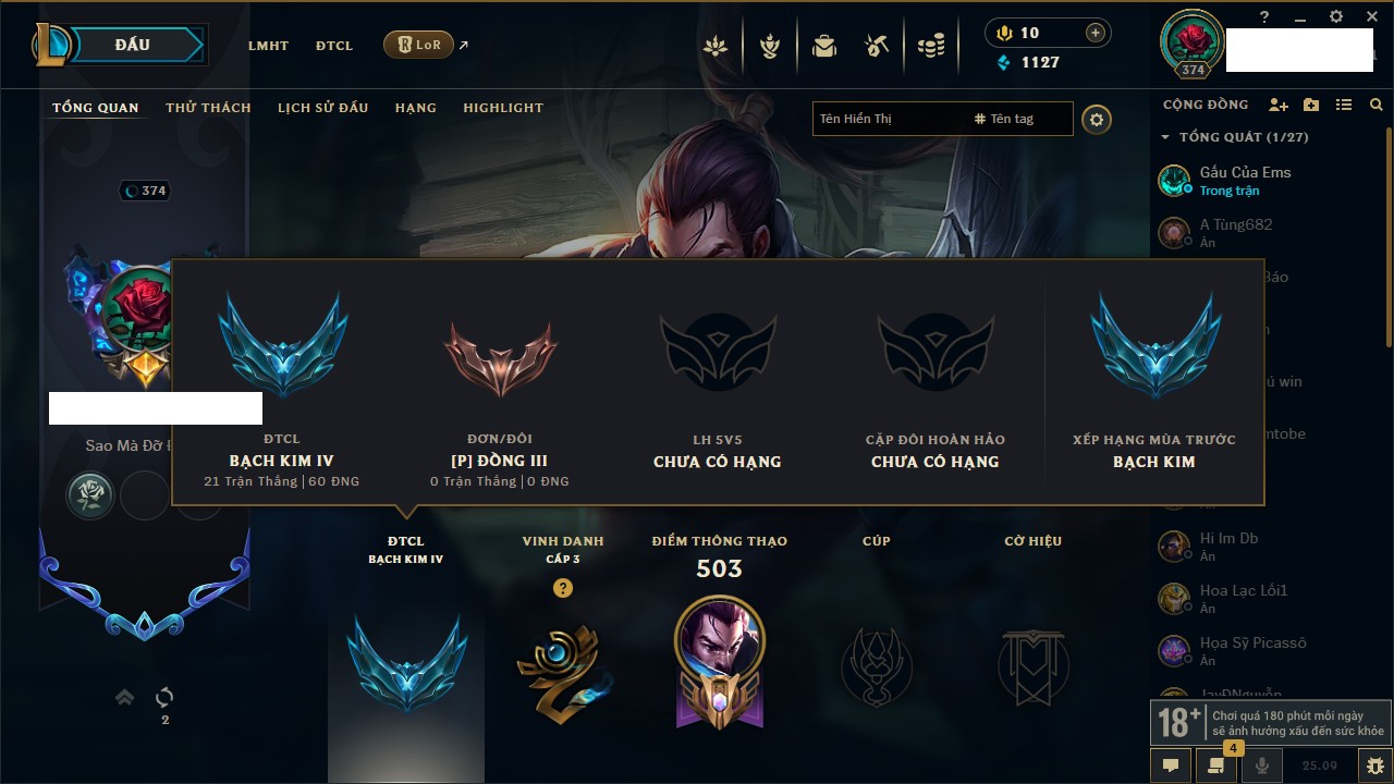 Rank Đơn: Vàng IVKhung: BạcTướng: 166 - Còn 180925 THXTrang Phục: 163Rank ĐTCL: Chưa RankLinh Thú: 67