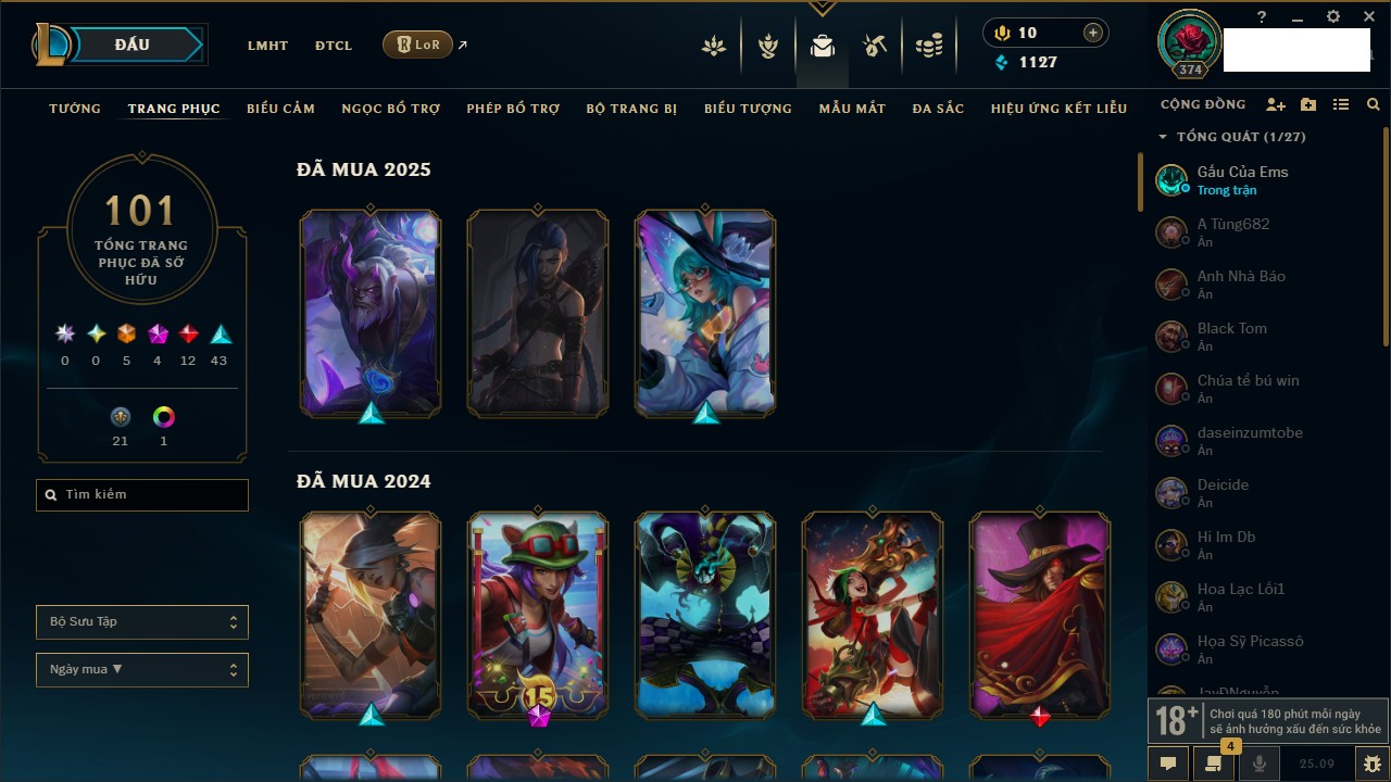 Rank Đơn: Vàng IVKhung: VàngTướng: 171 - Còn 48721 THXTrang Phục: 171Rank ĐTCL: Chưa RankLinh Thú: 27
