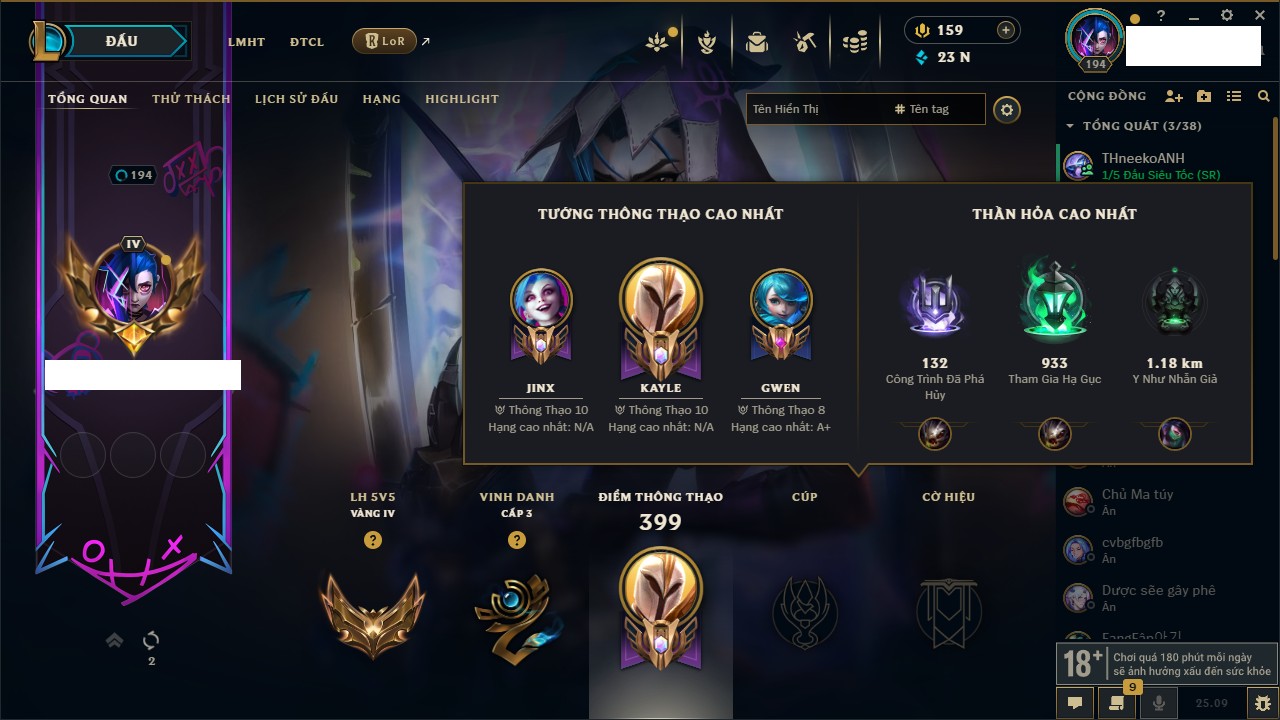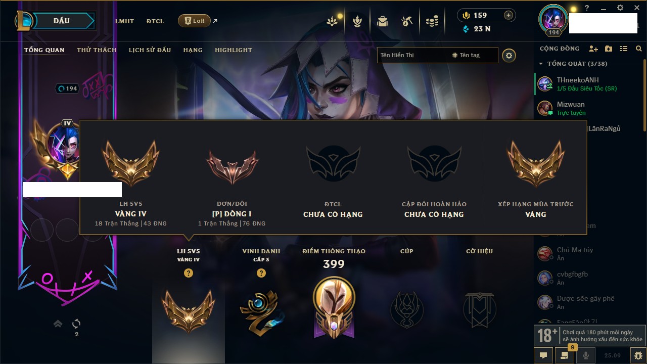 Rank Đơn: Chưa rank mùa nào Khung: Chưa có khung Tướng: 46 - Còn 7820 THX Trang Phục: 12 Rank ĐTCL: Chưa Rank Linh Thú: 250