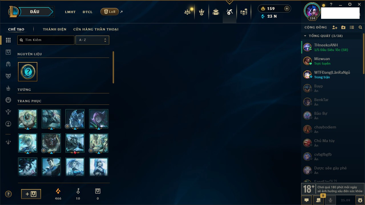 Rank Đơn: Chưa rank mùa nào Khung: Chưa có khung Tướng: 0 - Còn 10050 THX Trang Phục: 1 Rank ĐTCL: Chưa Rank Linh Thú: 143