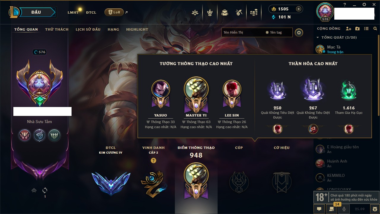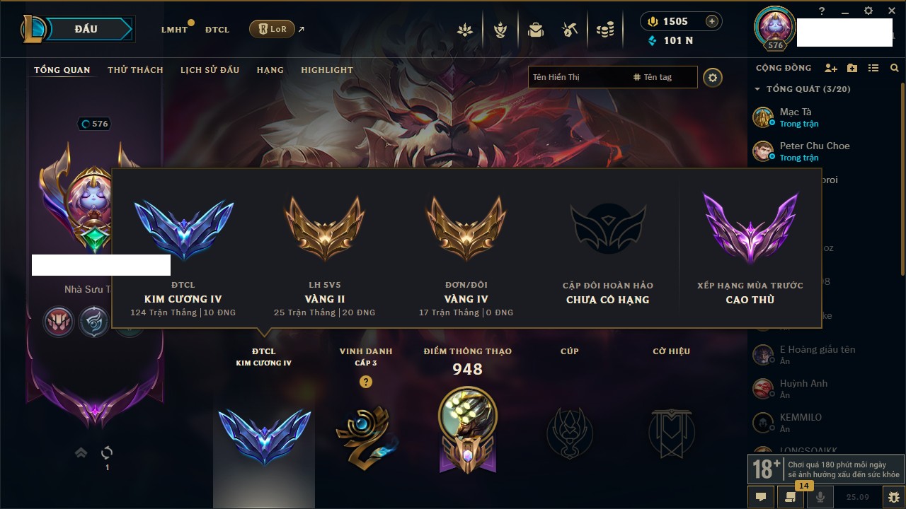 Rank Đơn: Bạc IIIKhung: Chưa có khungTướng: 171 - Còn 21493 THXTrang Phục: 252Rank ĐTCL: Bạch Kim IVLinh Thú: 123