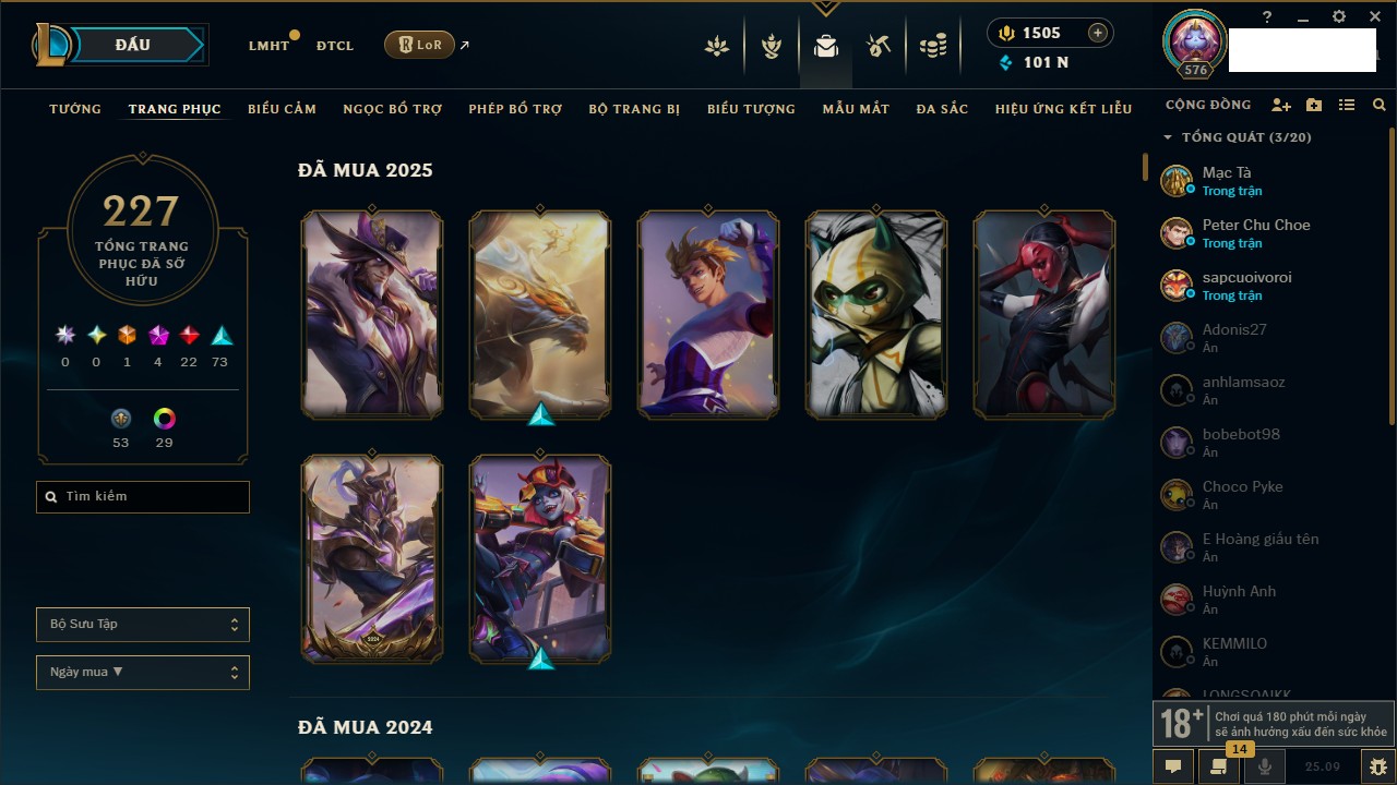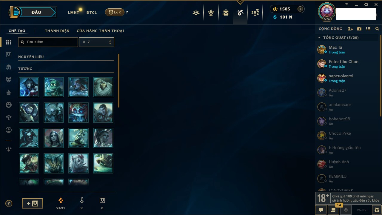 Rank Đơn: Vàng IIKhung: VàngTướng: 171 - Còn 34018 THXTrang Phục: 250Rank ĐTCL: Sắt IILinh Thú: 19
