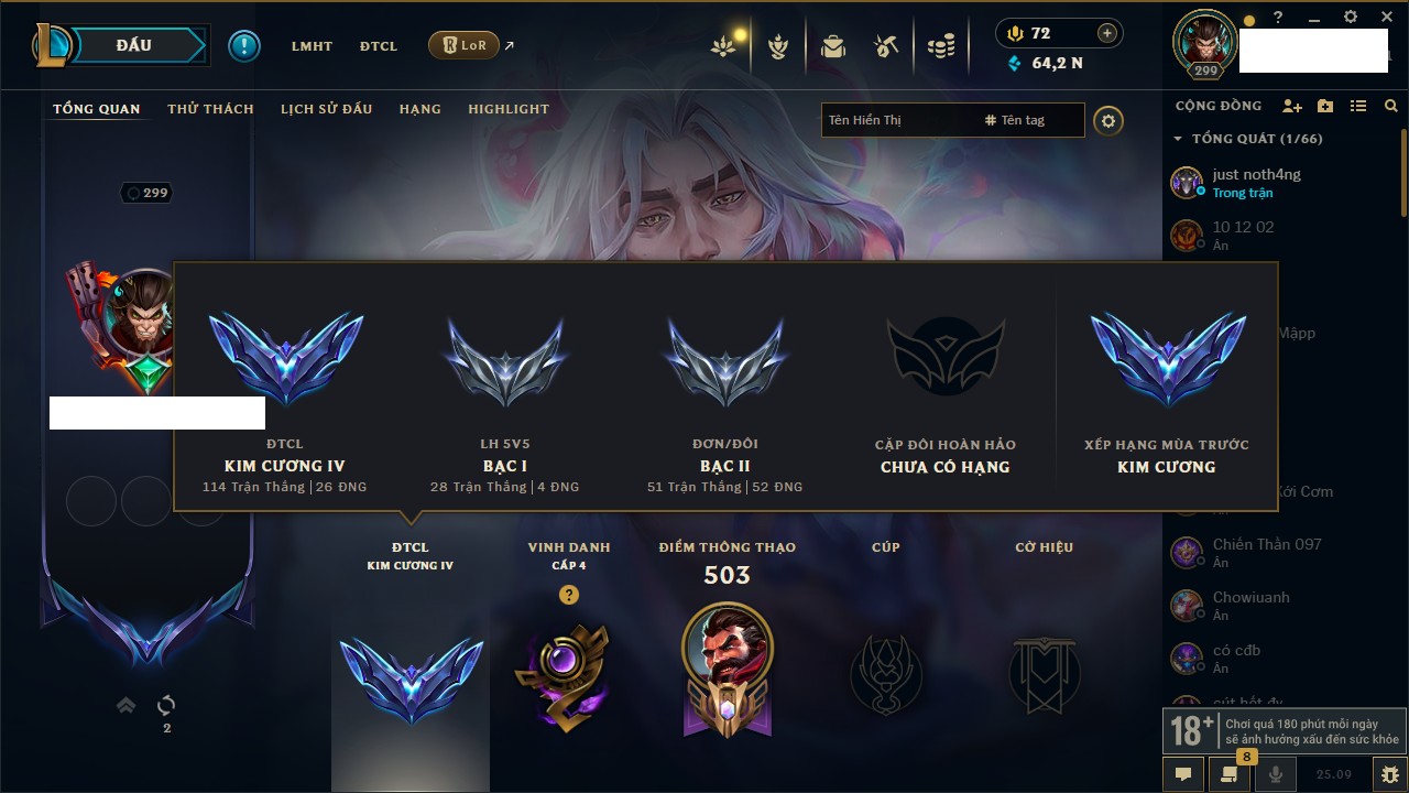 Rank Đơn: Lục Bảo IVKhung: VàngTướng: 171 - Còn 154648 THXTrang Phục: 203Rank ĐTCL: Bạch Kim IVLinh Thú: 69