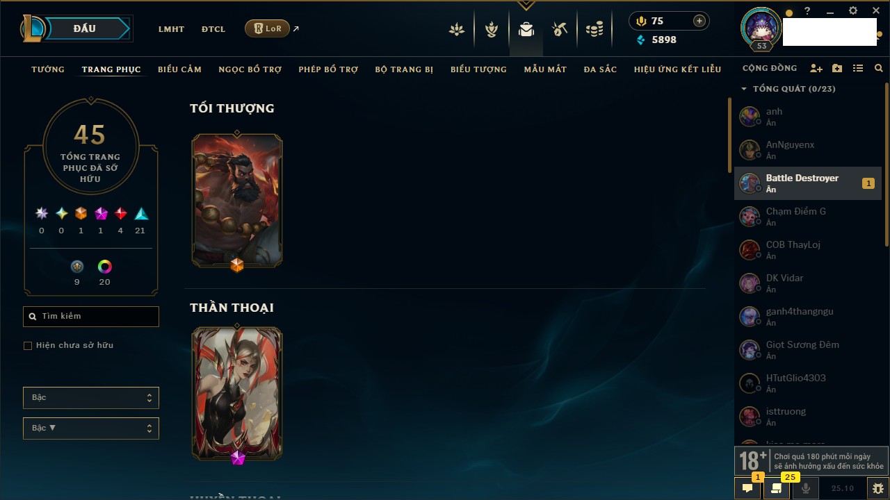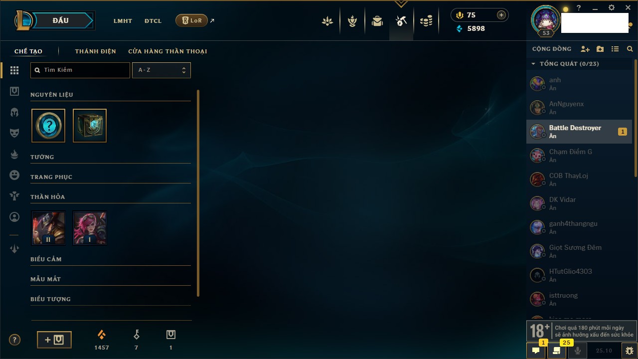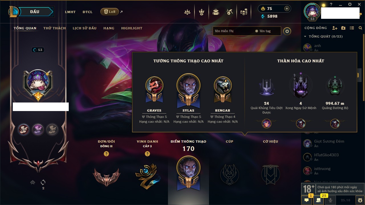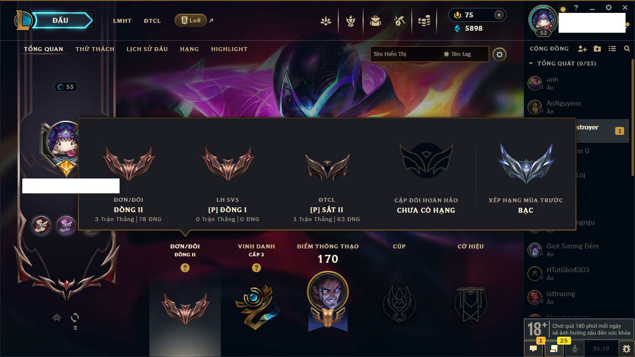 Rank Đơn: Chưa RankKhung: Chưa có khungTướng: 171 - Còn 164047 THXTrang Phục: 173Rank ĐTCL: Chưa RankLinh Thú: 77