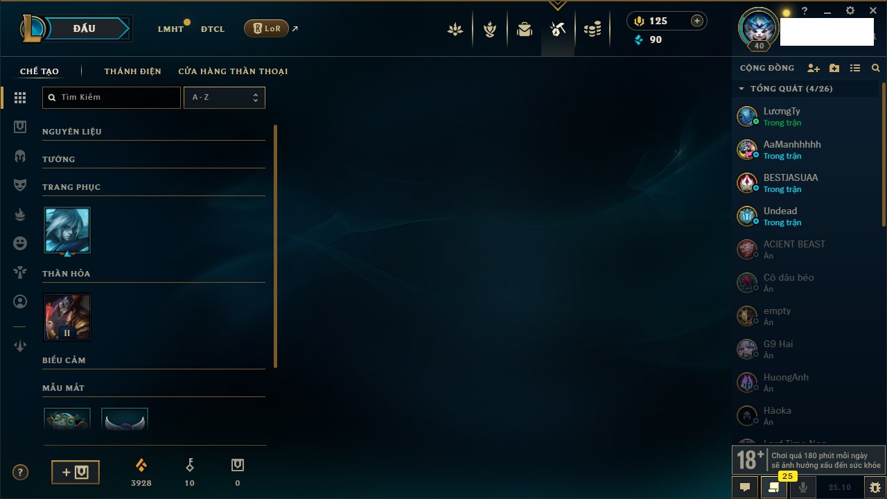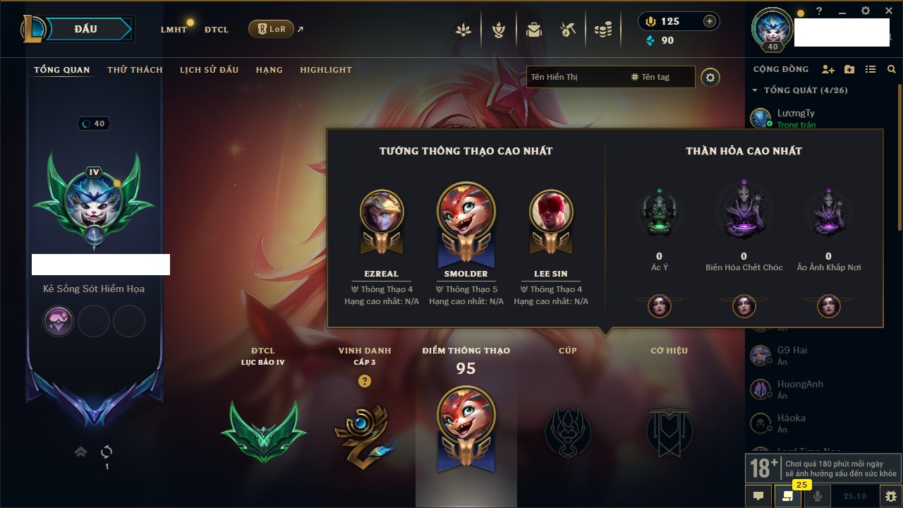 Rank Đơn: Sắt IIIKhung: Chưa có khungTướng: 49 - Còn 11000 THXTrang Phục: 6Rank ĐTCL: Chưa RankLinh Thú: 131