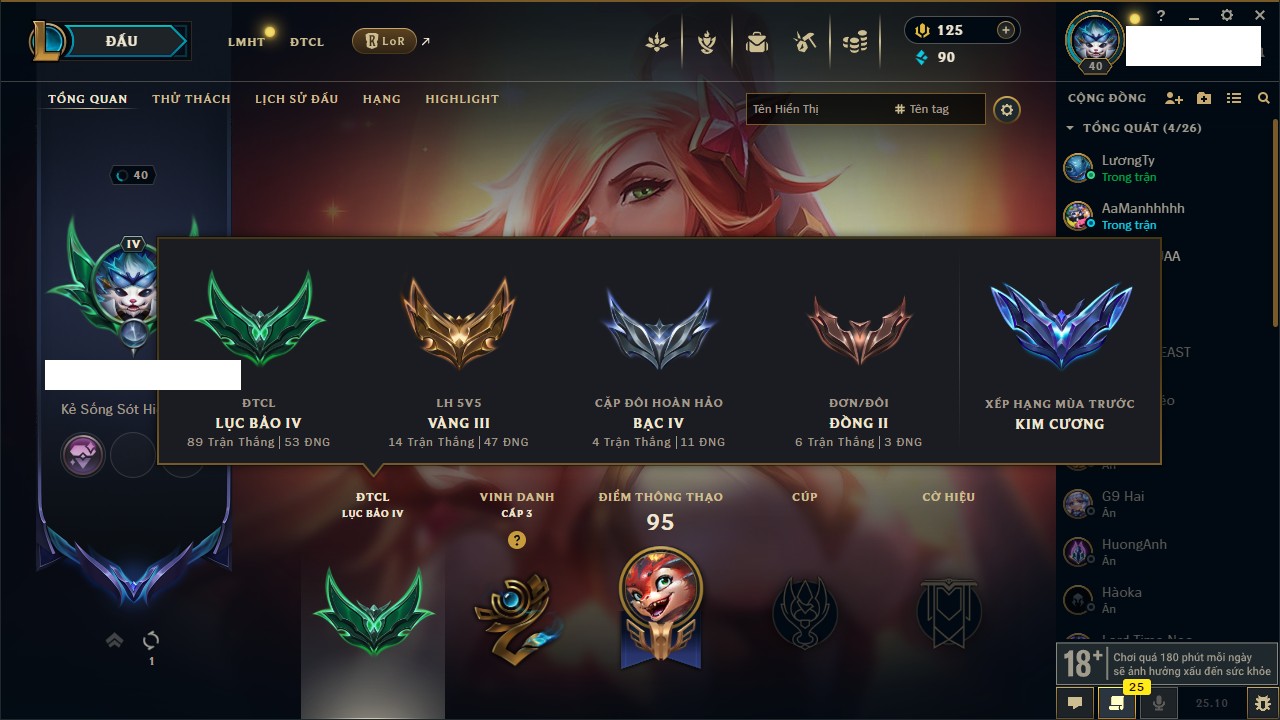 Rank Đơn: Đồng IIIKhung: Chưa có khungTướng: 86 - Còn 14367 THXTrang Phục: 19Rank ĐTCL: Vàng IIILinh Thú: 95