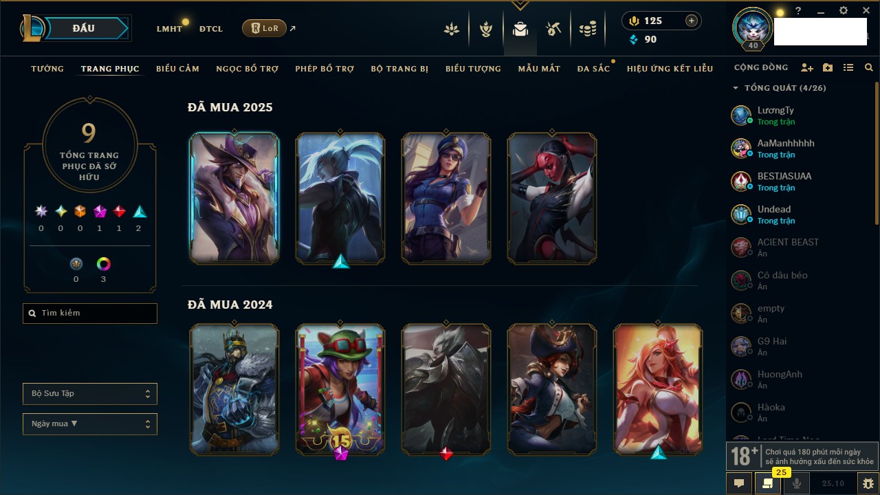 Rank Đơn: Sắt IIIKhung: Chưa có khungTướng: 88 - Còn 1376 THXTrang Phục: 12Rank ĐTCL: Bạc IVLinh Thú: 69