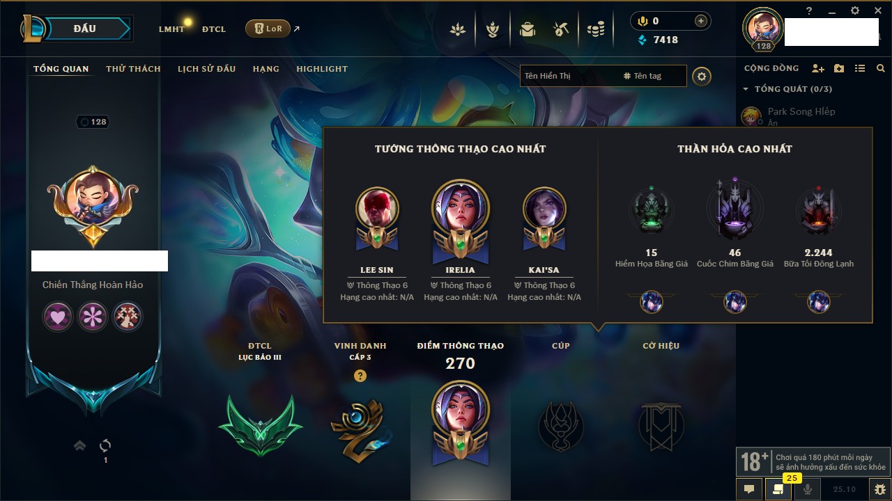 Rank Đơn: Bạc IVKhung: BạcTướng: 171 - Còn 7819 THXTrang Phục: 243Rank ĐTCL: Chưa RankLinh Thú: 102