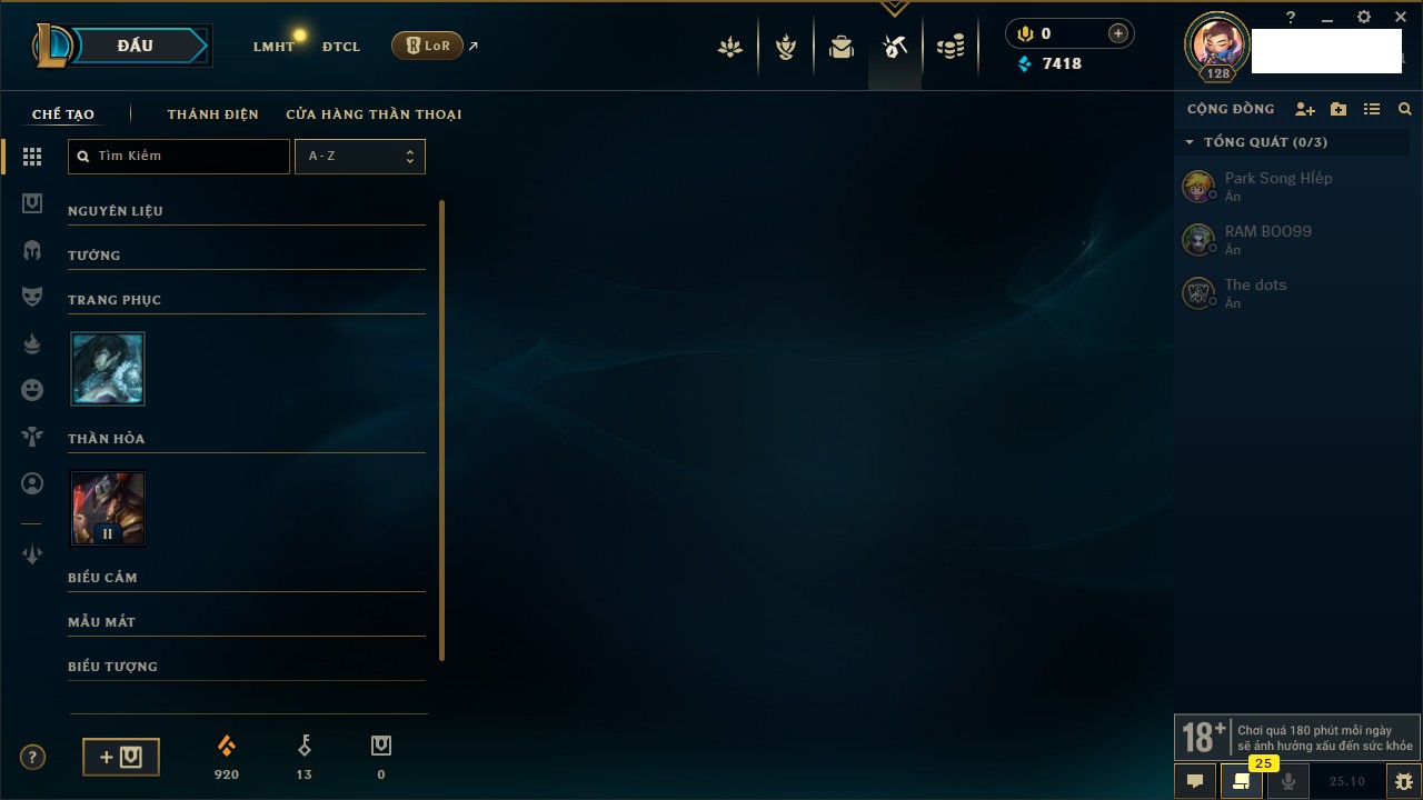 Rank Đơn: Bạc IIIKhung: Chưa có khungTướng: 171 - Còn 21493 THXTrang Phục: 252Rank ĐTCL: Bạch Kim IVLinh Thú: 123