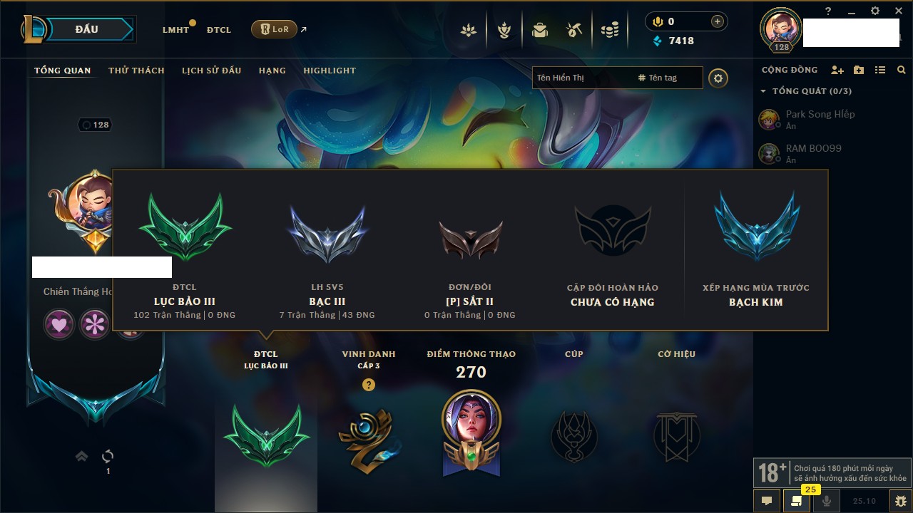 Rank Đơn: Bạch Kim IIIKhung: VàngTướng: 126 - Còn 23055 THXTrang Phục: 114Rank ĐTCL: Chưa RankLinh Thú: 21