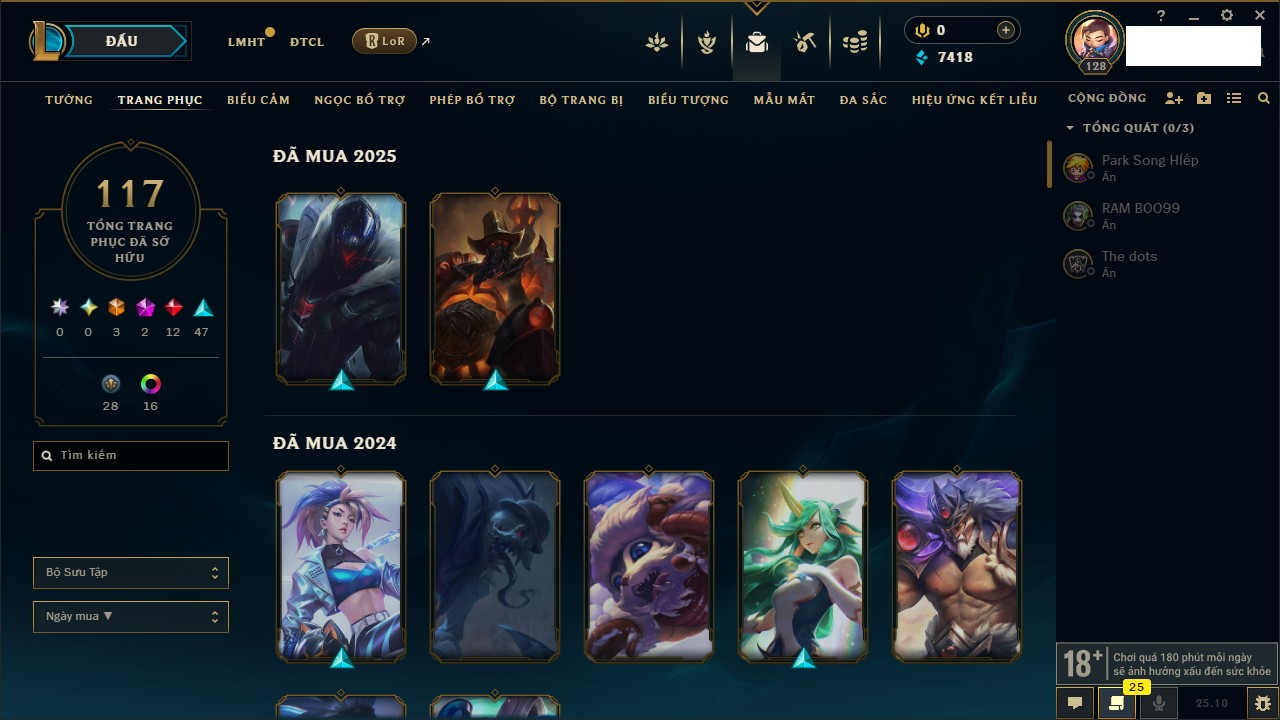 Rank Đơn: Vàng IIKhung: VàngTướng: 171 - Còn 34018 THXTrang Phục: 250Rank ĐTCL: Sắt IILinh Thú: 19