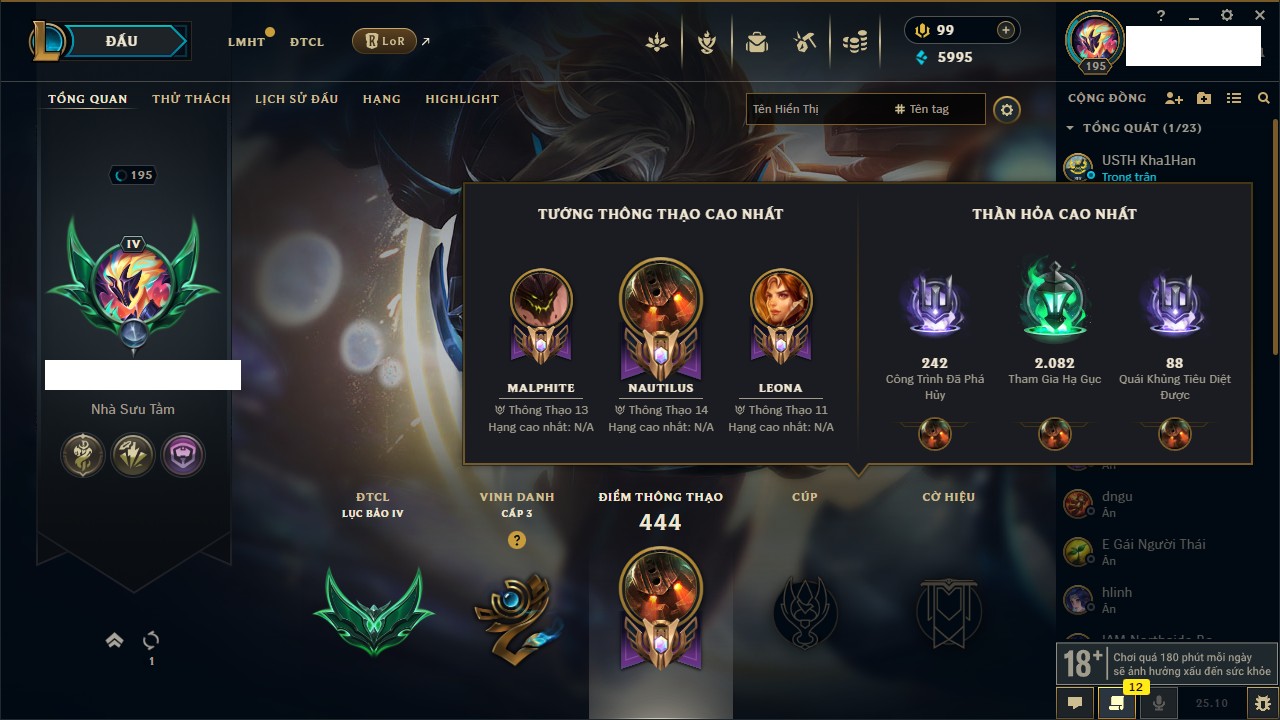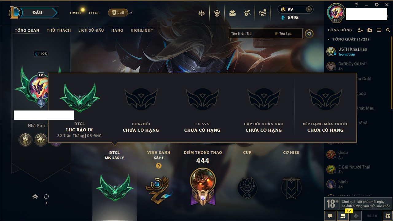 Rank Đơn: Bạc IVKhung: BạcTướng: 171 - Còn 7819 THXTrang Phục: 243Rank ĐTCL: Chưa RankLinh Thú: 102